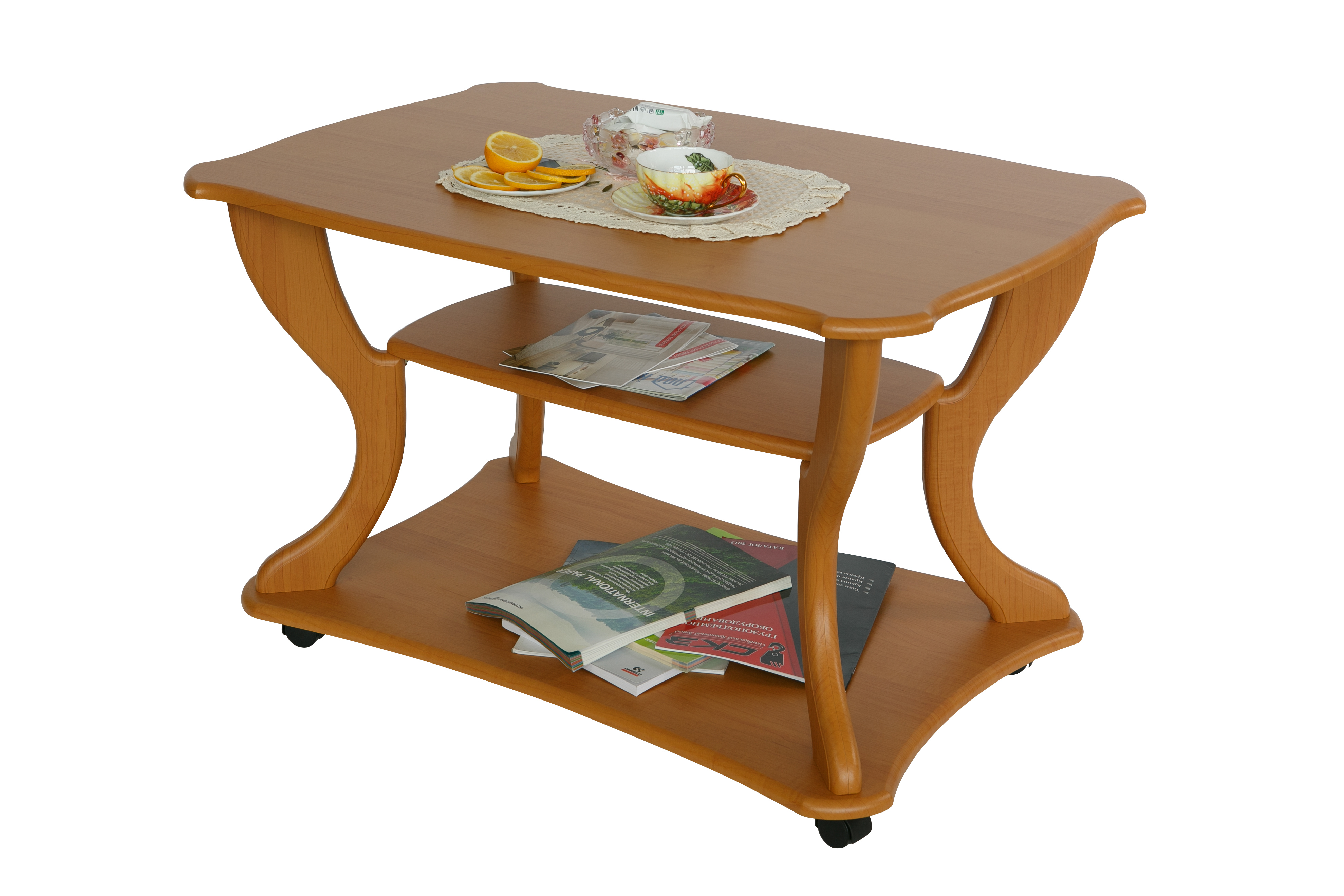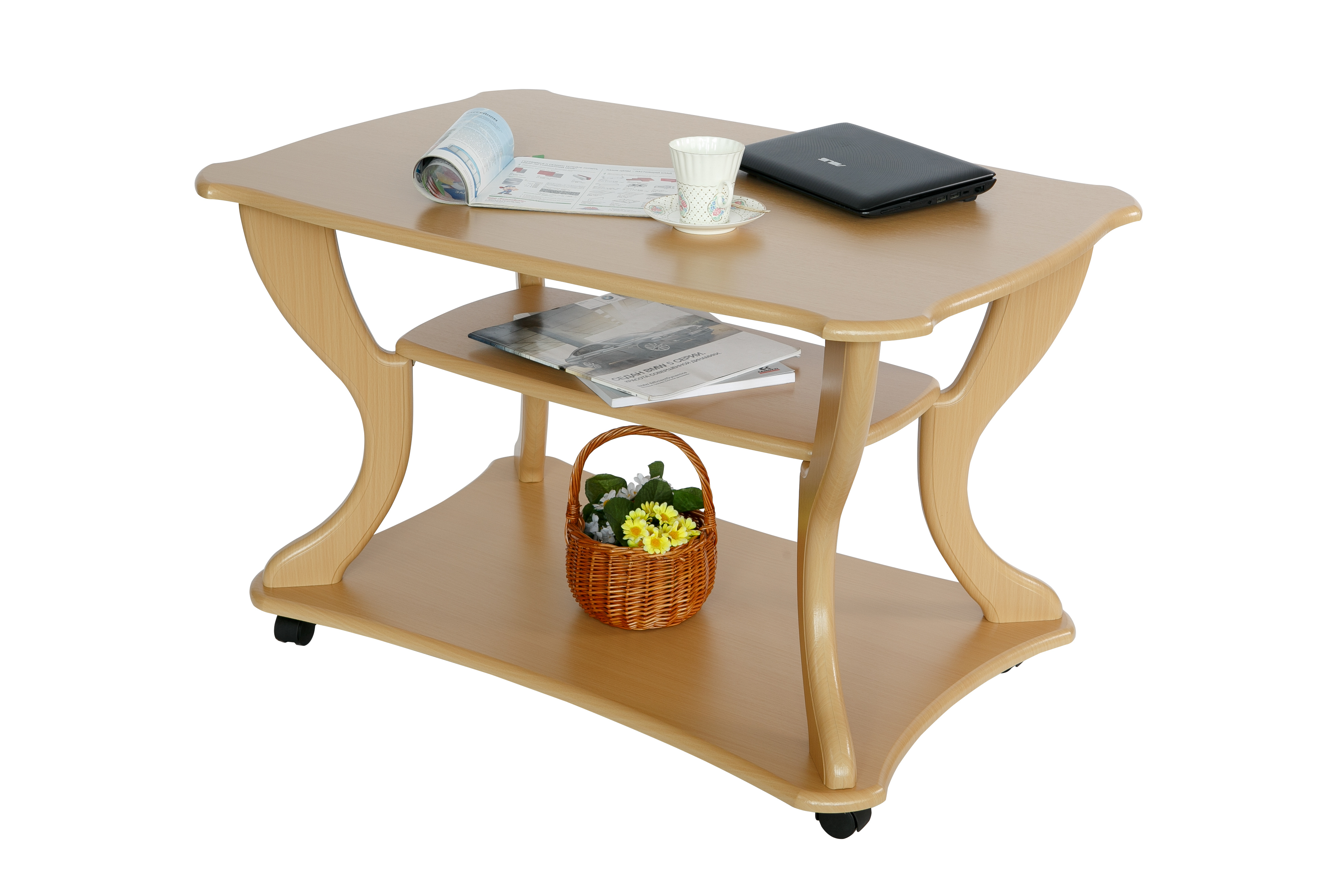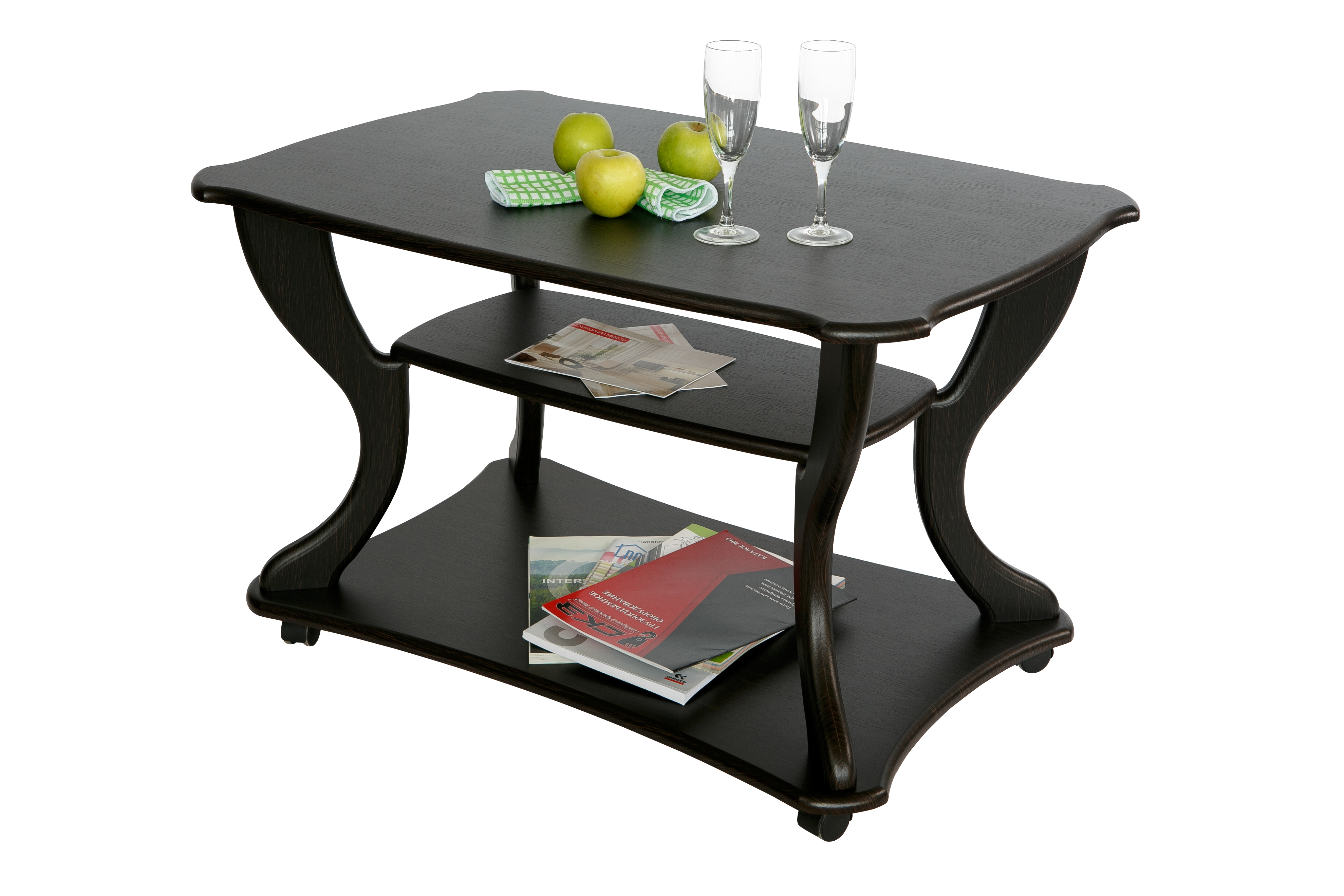 Журнальный стол по праву можно считать самым красивым предметом интерьера.Красивый и изящный журнальный стол «Маэстро» станет акцентом внимания в любом интерьере. Стол дополнен полкой длиной 600 мм, шириной 300 мм и основанием на колесной опоре, что позволит легко перемещать его по комнате. Размер столешницы: длина 900 мм, ширина 600 мм, высота стола 560 мм.