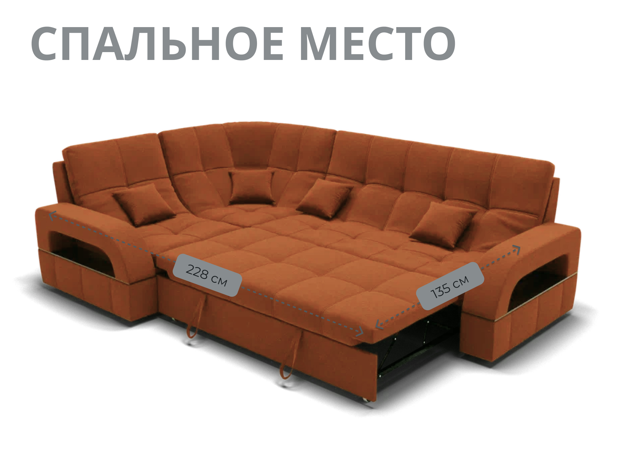 Спальное место имеет ширину 135 см и длину 211 см. Он предназначен для двух человек и имеет глубину сиденья 65 см. Максимальная нагрузка на диван составляет 280 кг.