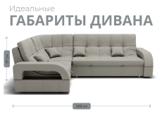 Он имеет высоту 97 см, ширину 187 см и глубину 268 см. Диван обладает универсальным расположением угла, что позволяет его использовать в любом помещении.