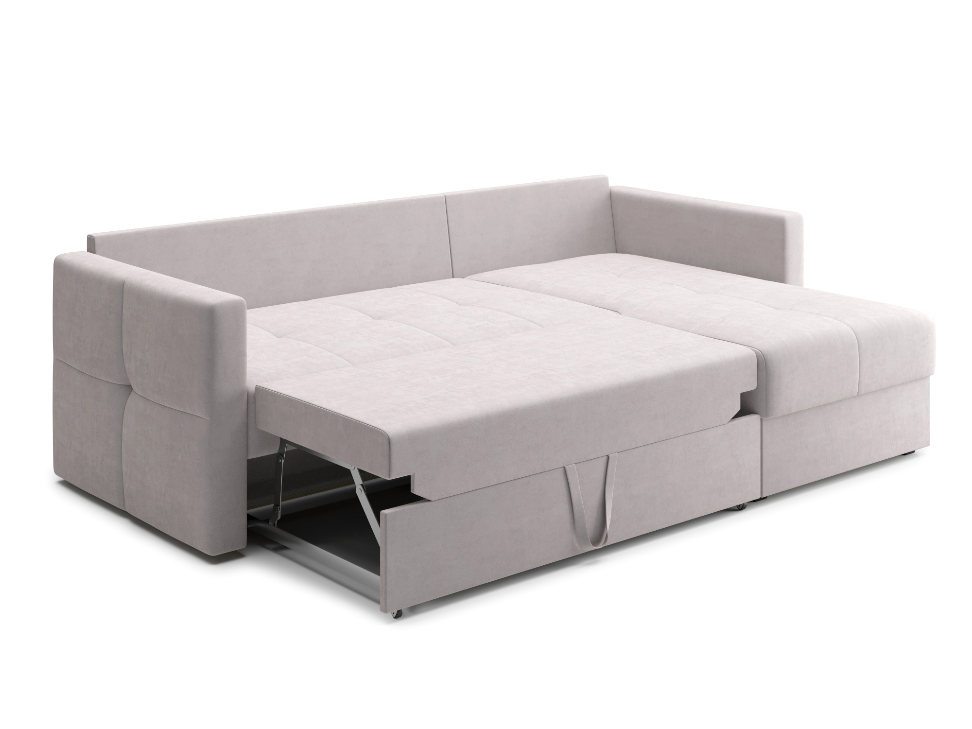 - Механизм раскладки дельфин – основан на выкатывании дополнительной платформы, скрытой под сидением дивана. Чтобы разложить диван, нужно потянуть за специальные ремешки, помогающие перемещать элементы конструкции. В результате этого действия нижняя часть дивана начнёт перемещаться. Делать это нужно до тех пор, пока часть не выдвинется максимально вперед. Затем следует немного приподнять элемент и упереть в противоположную часть, которая осталась неподвижной. Под сиденьем дивана находится короб для хранения вещей и постельных принадлежностей.