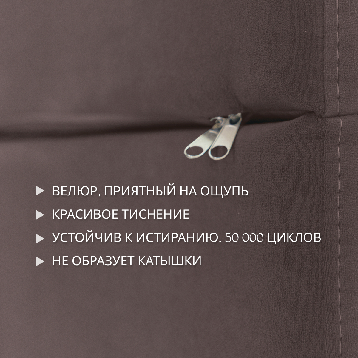 Изделие создано полностью из качественного ППУ марки ST толщиной 200 мм. Кресло изготовлено из износостойкого велюра, который имеет 50 000 циклов по мартиндейлу (по стандарту необходимо 20 000). Максимальная нагрузка 100 кг.