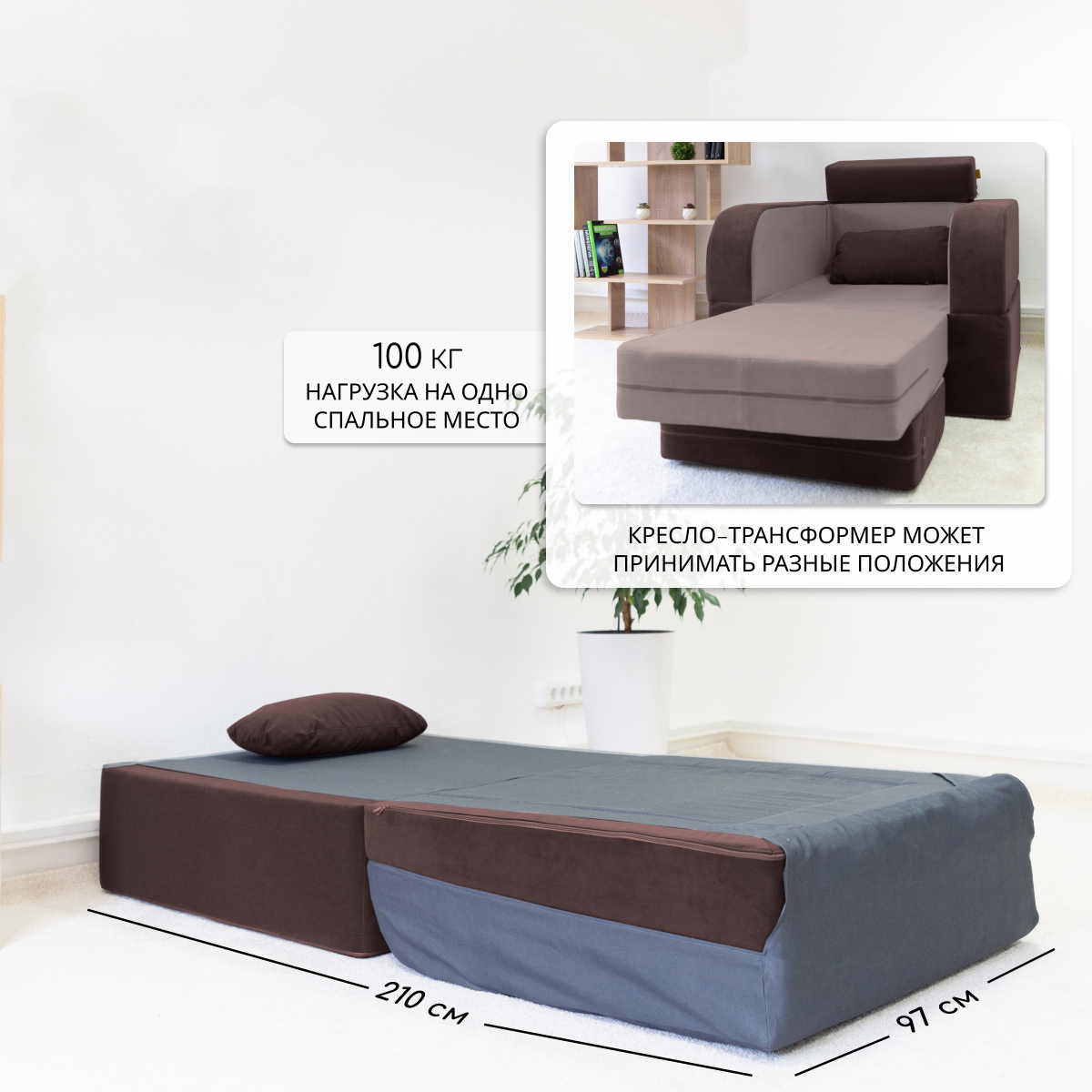 Это кресло-трансформер легко превращается в полноценное спальное место, что делает его незаменимым элементом интерьера как квартиры, так и загородного дома. Благодаря своему компактному размеру оно идеально впишется в детскую комнату, спальню, гостиную или даже на балкон или кухню.