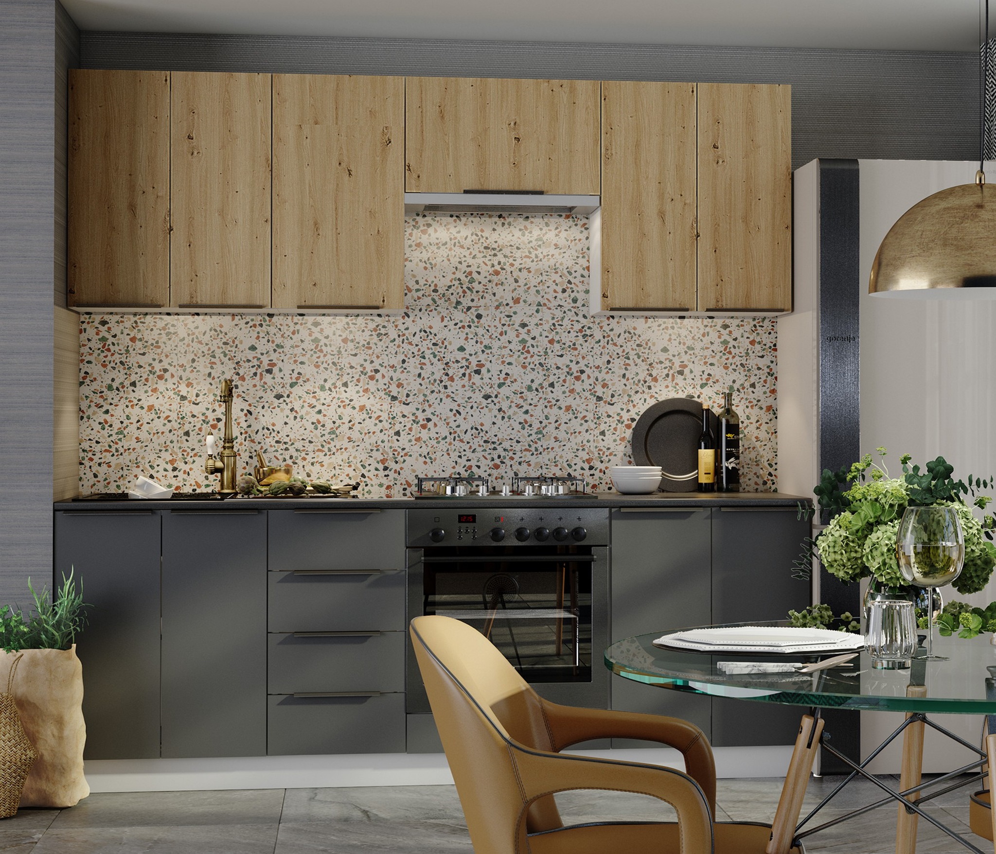 • Стеновая панель, защищающая стены от брызг и гармонирующая с цветовым решением кухни