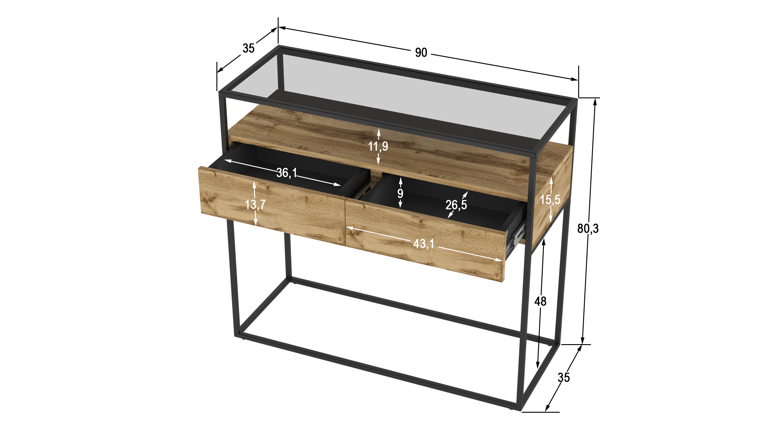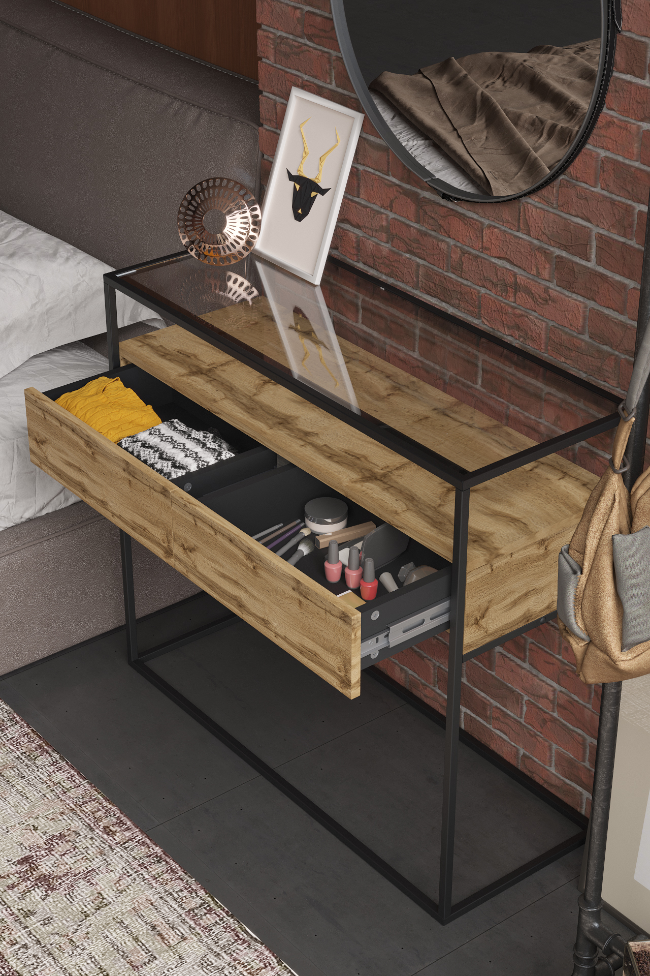 Консоль «Эйден» выполнена в современном лаконичном стиле и уместно дополнит интерьер спальной комнаты или прихожей. Стильная консоль приковывает внимание прежде всего своим исполнением: комбинацией используемых материалов. Стеклянная столешница из тонированного закаленного стекла в сером цвете дополнена полкой и ящиками для удобного хранения подручных вещей с системой открывания PUSH-TO-OPEN. А прочный металлический профиль толщиной 15 мм обеспечивает высокую прочность и устойчивость. Цветовое решение консоли можно выбрать из вариантов предложенных нашей фабрикой. Дизайнерский прием - возможность комбинировать с другими предметами интерьера из серии "Эйден", позволяя воссоздать атмосферу истинного комфорта и удобства.