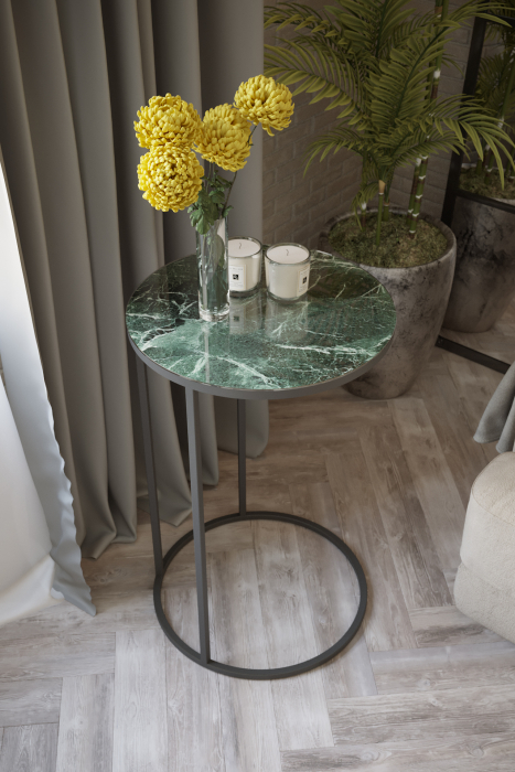 Лофт-это стиль, который прекрасно подойдет для практичных людей. А стол, выполненный в таком стиле, станет замечательным дополнением любого интерьера. Конструкция придиванного столика "Остин УФ" позволяет расположить столешницу прямо над диваном или боковиной дивана, что достаточно удобно и функционально. Данный предмет мебели в декоре лофт будет отличаться лаконичной простотой, без излишеств. Техническая виртуозность исполнения столешницы подчеркивается яркой УФ печатью в эксклюзивных цветах, благодаря чему данная модель приобретает визуальную утонченность. Цветовая гамма столешницы из закаленного стекла с УФ печатью с точность передает природный рисунок в цвете зеленый мрамор или неро. Благодаря габаритным размерам 450*450*705 мм стол "Остин УФ" можно с легкостью расположить в пространстве гостиной или офиса.