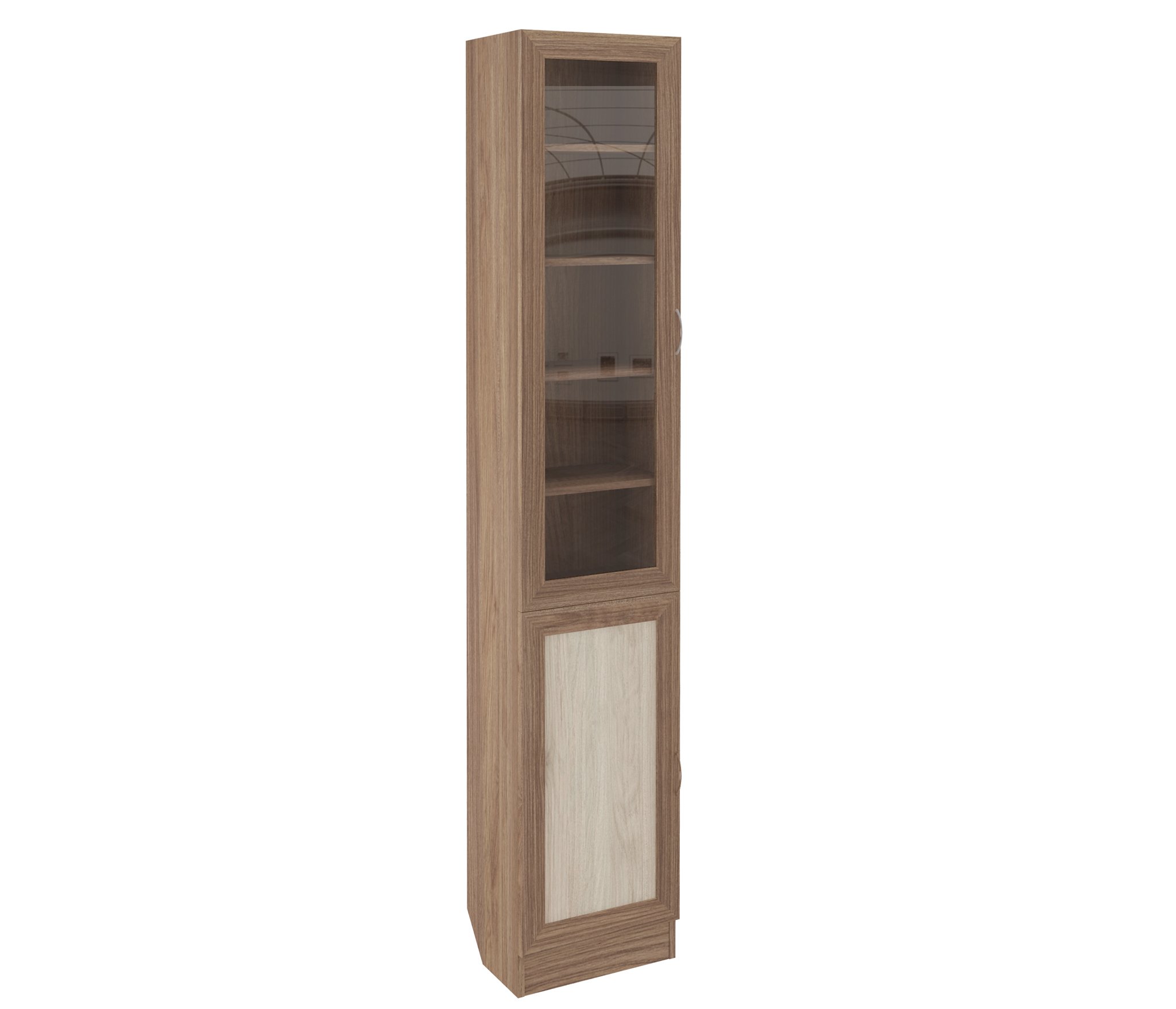 Шкаф ШК-1/7 со стеклом выполнен из Ламинированной ДСП высокого качества с насыщенным цветом. Фасады выполнены из материала МДФ.Шириною 30 см., этот распашной пенал-библиотека имеет в себе 8 отсеков, 3 из них снизу закрыты глухой дверцей, 5 из них сверху закрыты дверцей с вмонтированным в нее стеклом.