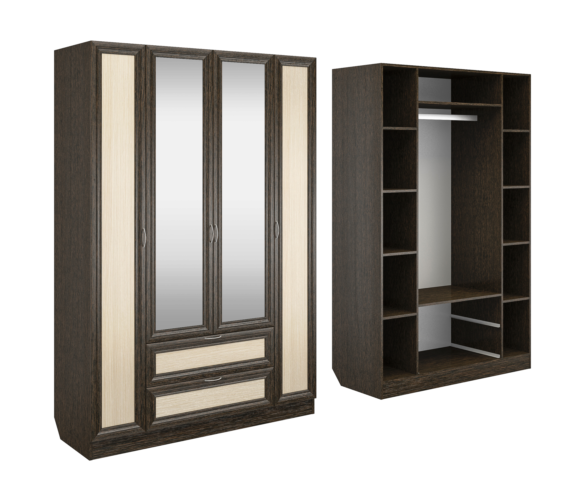 Корпус шкафа выполнен из Ламинированной ДСП высокого качества с насыщенным цветом. Фасады выполнены из материала МДФ.В данной моделе используются зеркала, которые внедрены в рамки фасадов.Шириною 140 см., красивый и удобный четырехстворчатый шкаф. По бокам слева и справа секции, по четыре полки в каждой. В центре сверху узкая ниша, под ней большая секция со штангой для одежды. В самом низу два выдвижных ящика. Два зеркала в данной моделе уже включены в стоимость.