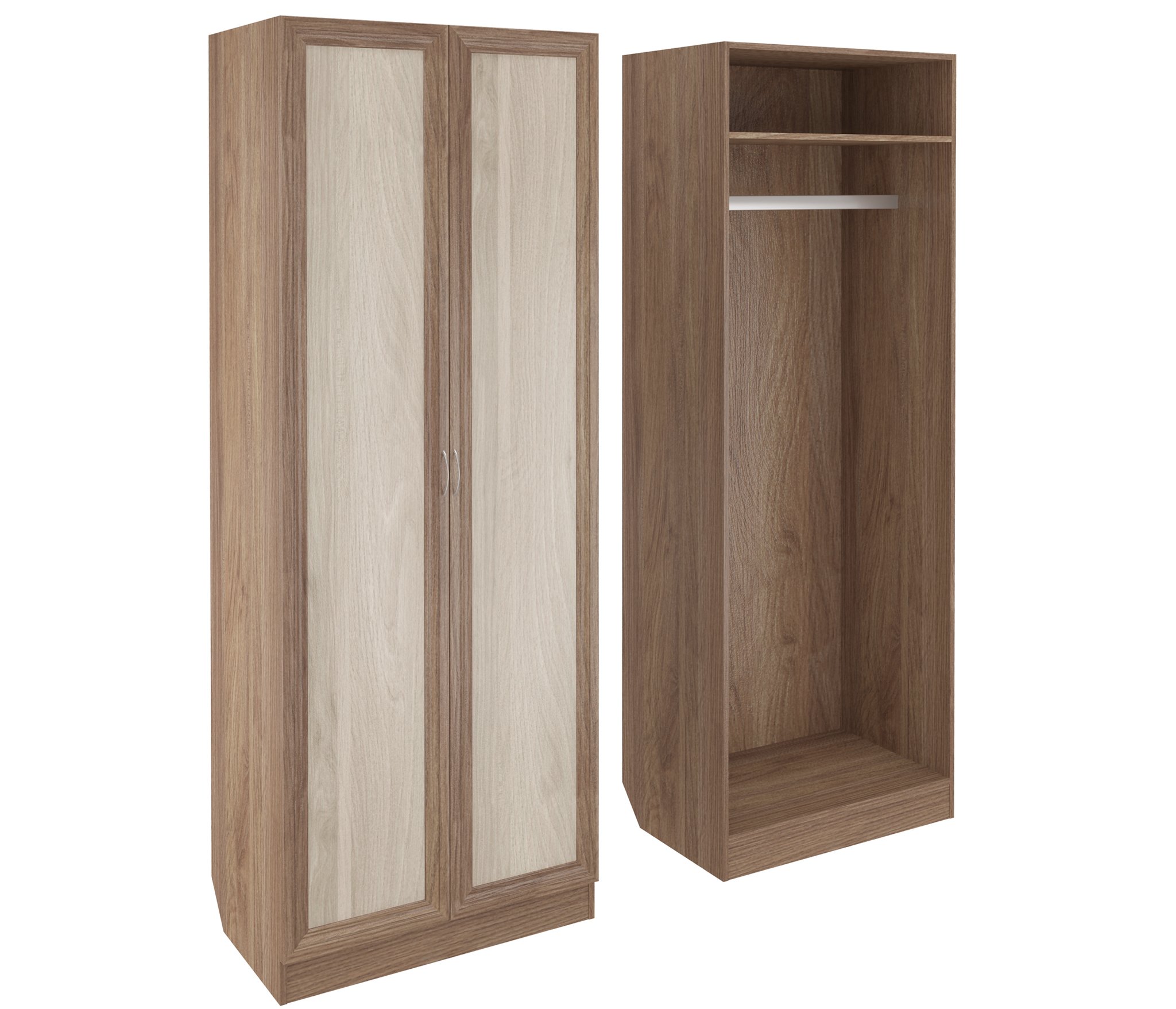 Корпус шкафа ШК-2 выполнен из Ламинированной ДСП высокого качества с насыщенным цветом. Фасады выполнены из материала МДФ.Шириною 80 см., это классический шкаф для верхней одежды, несет в себе следующие элементы. За распашными дверьми большая штанга, над ней ниша.