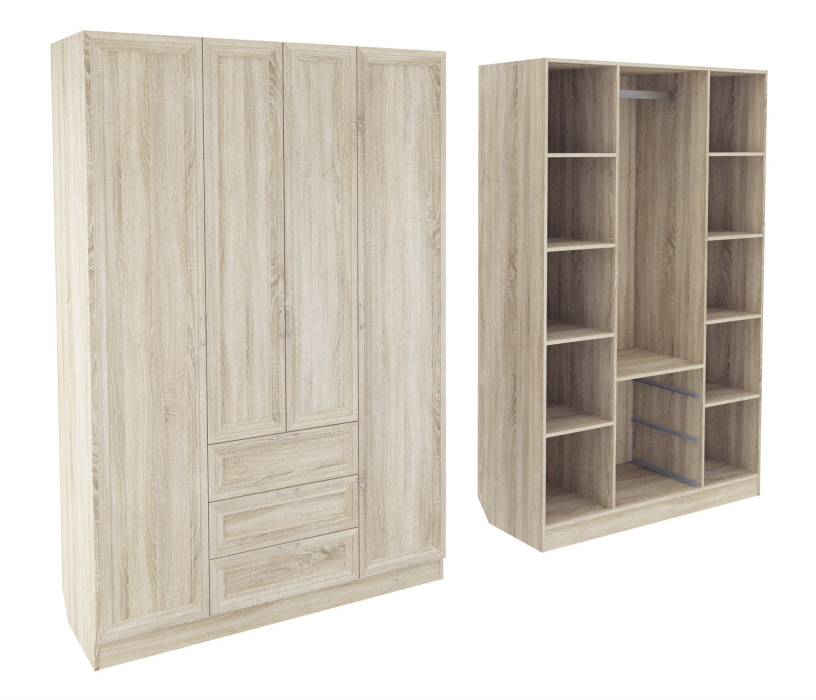 Корпус шкафа выполнен из Ламинированной ДСП высокого качества с насыщенным цветом. Фасады выполнены из материала МДФ.Шириною 140 см., красивый, удобный и очень функциональный четырехстворчатый шкаф. По краям слева и справа секции по четыре полки в каждой. В центре сверху узкая ниша, под ней большая секция со штангой для одежды. В самом низу встроены три выдвижных ящика.