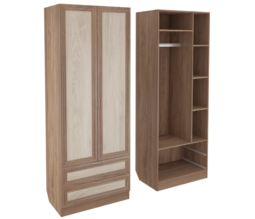 Корпус шкафа выполнен из Ламинированной ДСП высокого качества с насыщенным цветом. Фасады выполнены из материала МДФ.Шириною 80 см., эта многофункциональная модель несет в себе следующие элементы. За распашными дверьми штанга для одежды с одной стороны и стеллаж с полками с другой. Внизу расположены два выдвижных ящика.