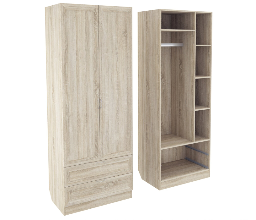 Корпус шкафа выполнен из Ламинированной ДСП высокого качества с насыщенным цветом. Фасады выполнены из материала МДФ.Шириною 80 см., эта многофункциональная модель несет в себе следующие элементы. За распашными дверьми штанга для одежды с одной стороны и стеллаж с полками с другой. Внизу расположены два выдвижных ящика.