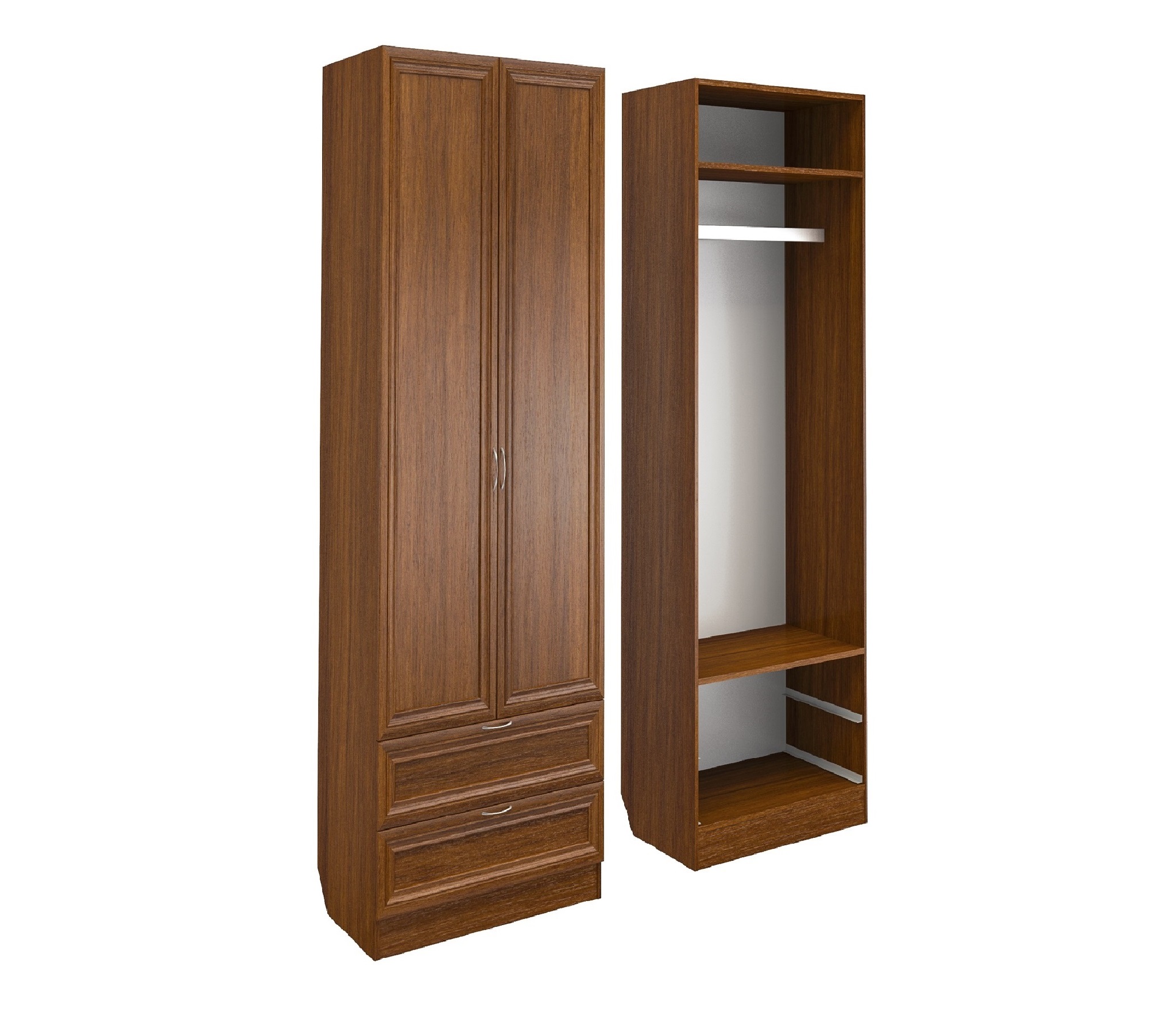 Корпус шкафа выполнен из Ламинированной ДСП высокого качества с насыщенным цветом. Фасады выполнены из материала МДФ.Шириною 60 см., эта многофункциональная модель несет в себе следующие элементы. За распашными дверьми находится штанга для одежды. Внизу расположены два выдвижных ящика.