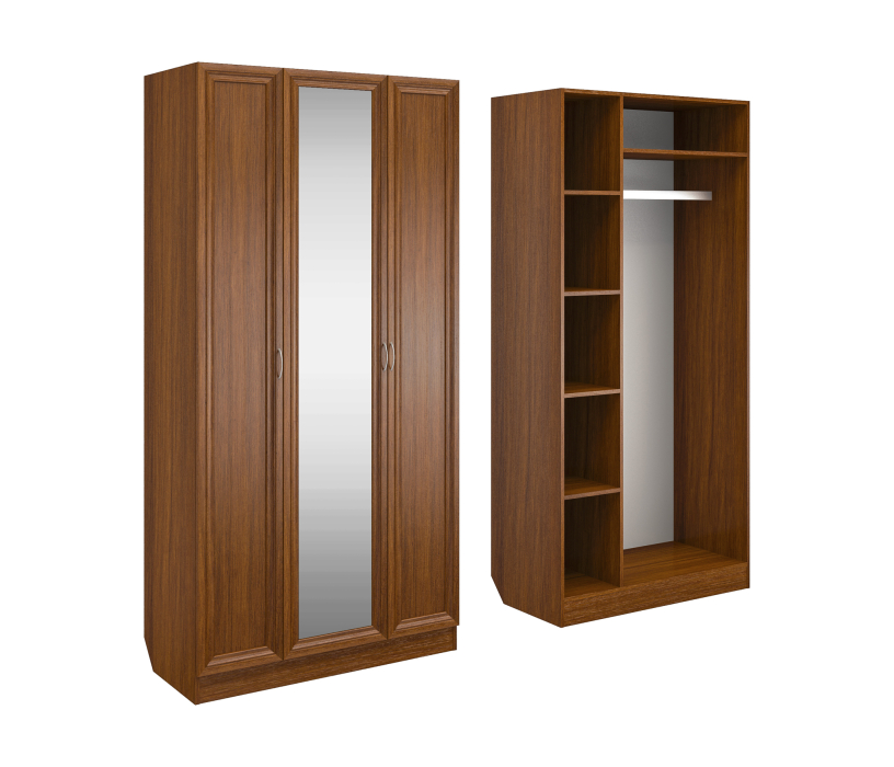 Корпус шкафа выполнен из Ламинированной ДСП высокого качества с насыщенным цветом. Фасады выполнены из материала МДФ.Ширина шкафа 100 см., большая и функциональная трёхстворчатая модель. В левой секции ниши для сложенных вещей. Справа штанга для одежды.В данной моделе установлено зеркало, которое монтируется на производстве в рамку фасада двери шкафа