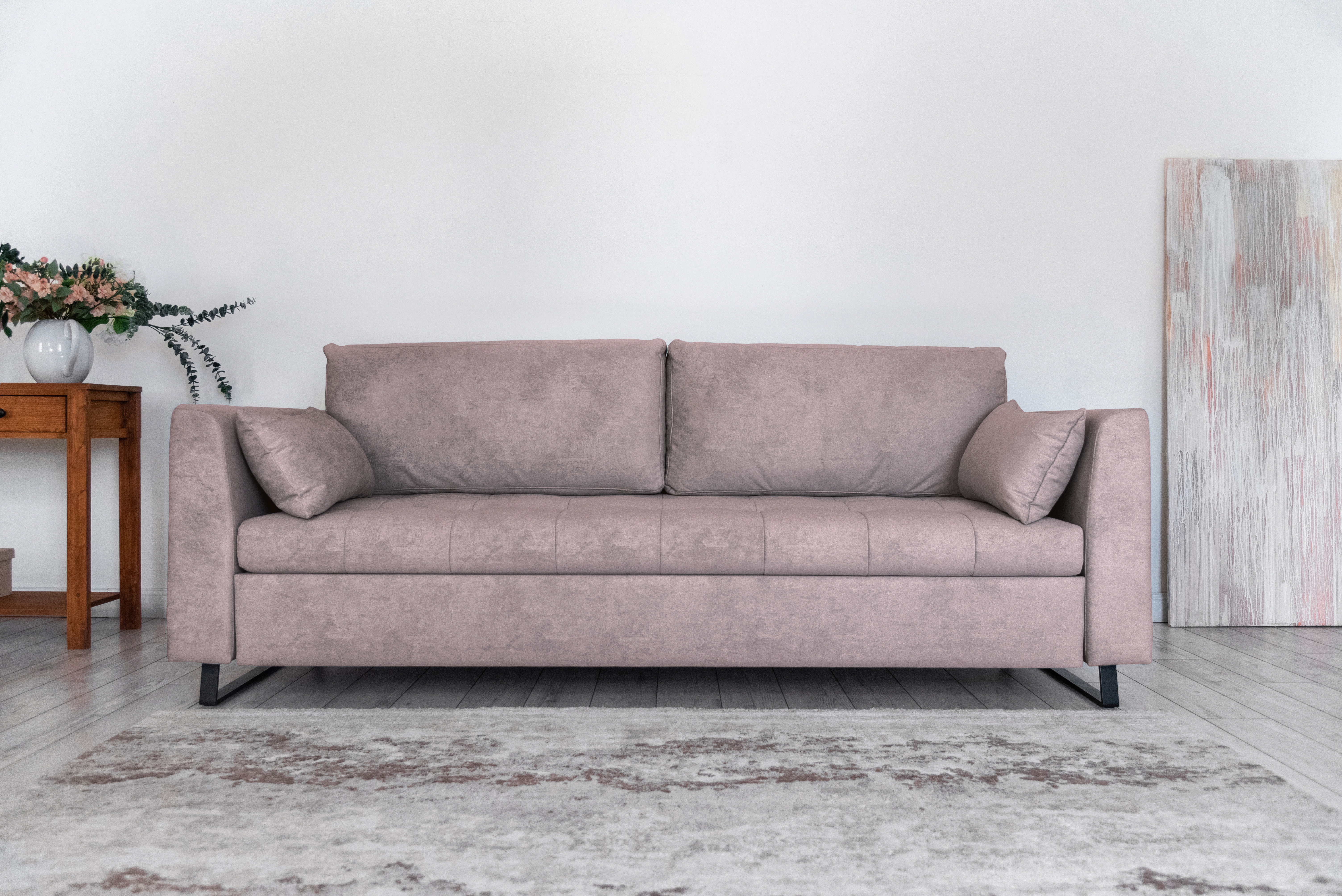 Механизм трансформации — шагающий (пантограф). Что позволяет использовать этот диван вместе с высокими коврами, и значительно упрощает раскладывание.