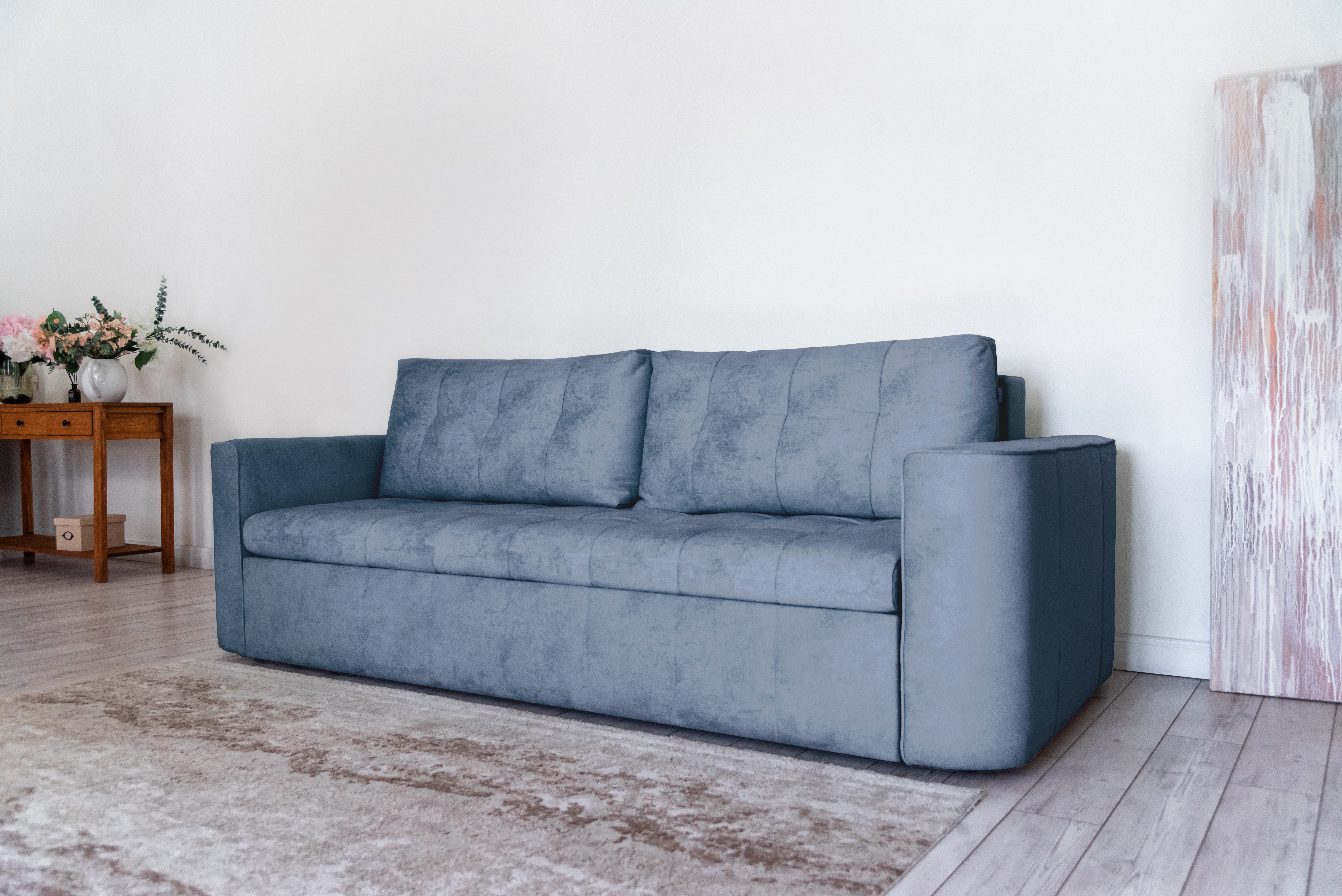 Стильный прямой диван BOSTON создан для тех, кому важна практичность и комфорт: надежный металлокаркас, мягкие ткани и быстрая трансформация в спальное место! Спинка защищает от соприкосновения со стеной во время сна.