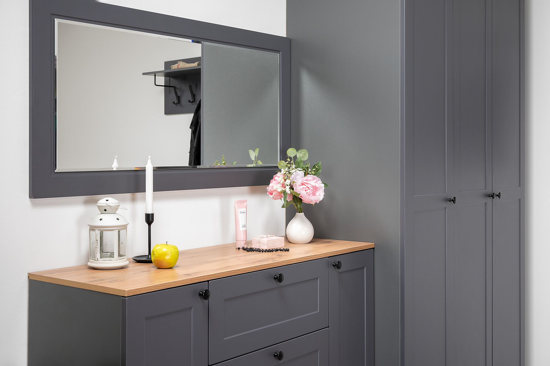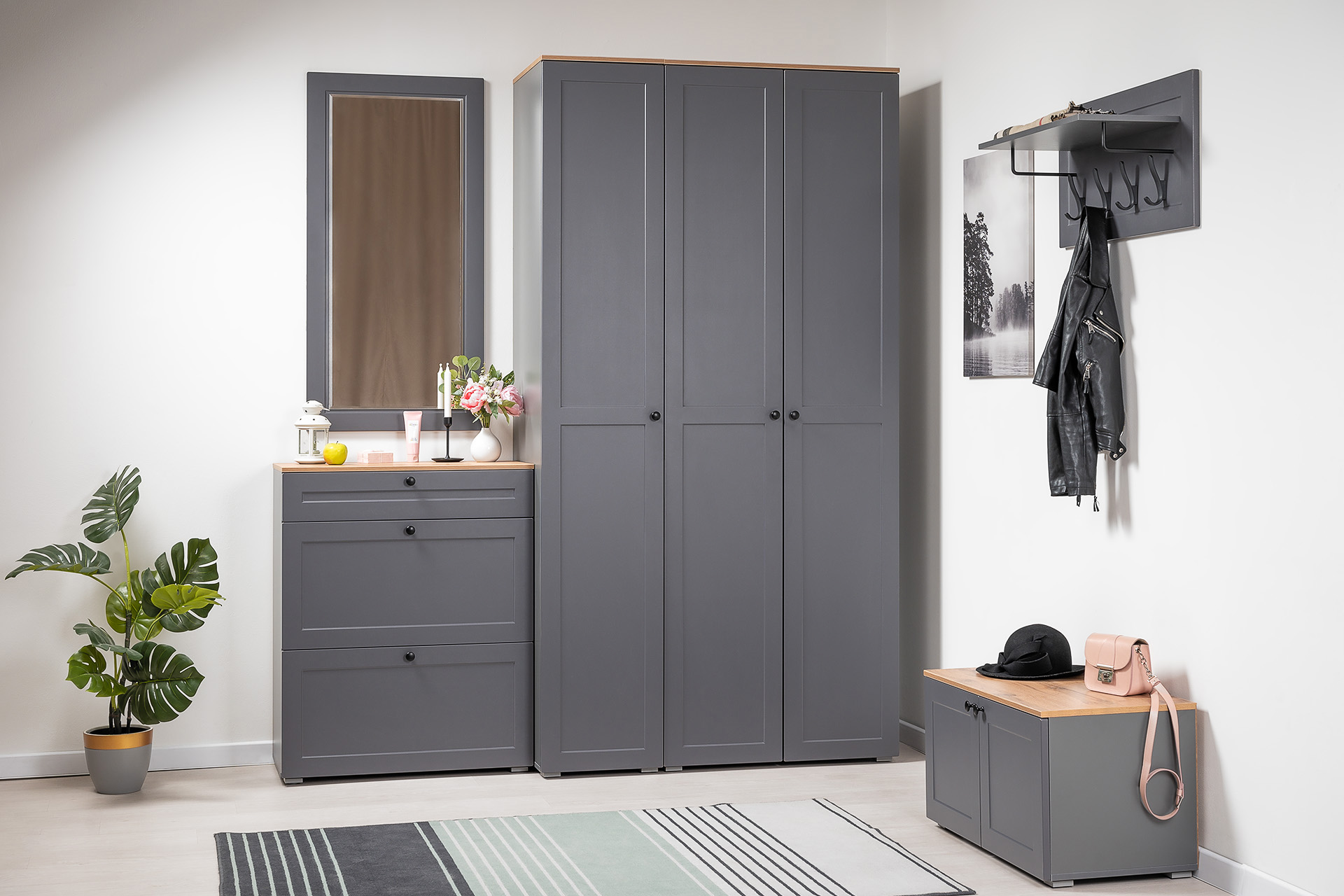 Вместительная шкафная группа позволит оптимально организовать хранение, а продуманные габариты тумбы, комода и зеркала дают возможность собрать различные компоновки.