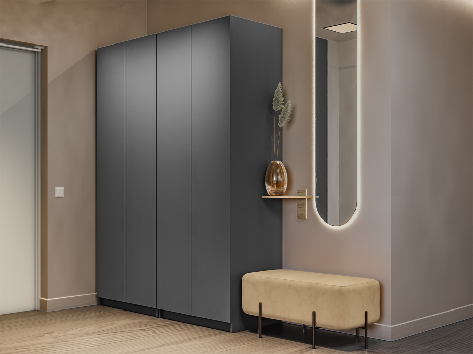 Шкаф оснащен долговечной, ударостойкой кромкой ПВХ, которая защищает торцы от сколов и повреждений, что обеспечит вам комфортное и долгое использование гардероба. Складная система дверей WingLine L с механизмом Push to Move позволяет открыть шкаф всего одним нажатием на фасад. Плавный и тихий ход, надежность в эксплуатации и максимальное складывание дверей — это инновационный подход к организации порядка. Данная система обеспечивает панорамный эффект и свободу в дизайне.