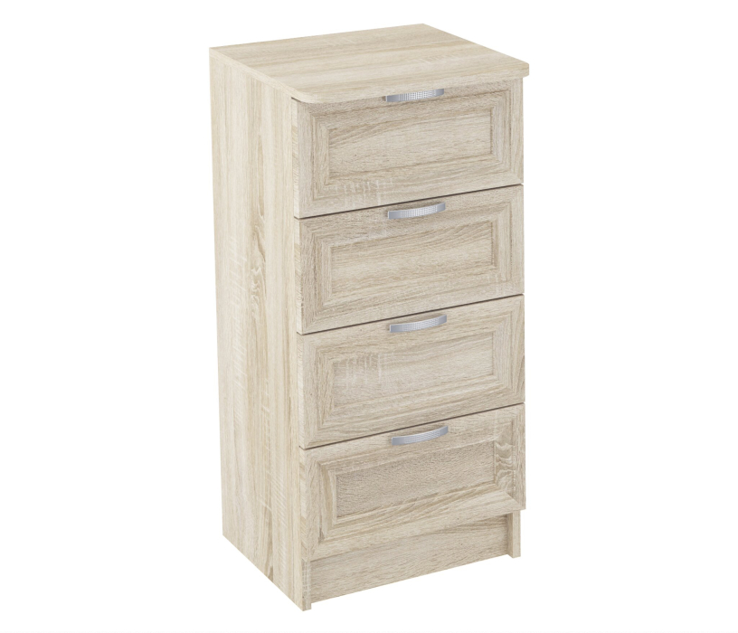 Комод ВС 400 благодаря не большой ширине 42 см,удачно разместится даже в маленьком помещении.Тем не менее,4 выдвижных ящика,позволяют разместить множество вещей.Корпус ЛДСП,фасады рамочные МДФ.