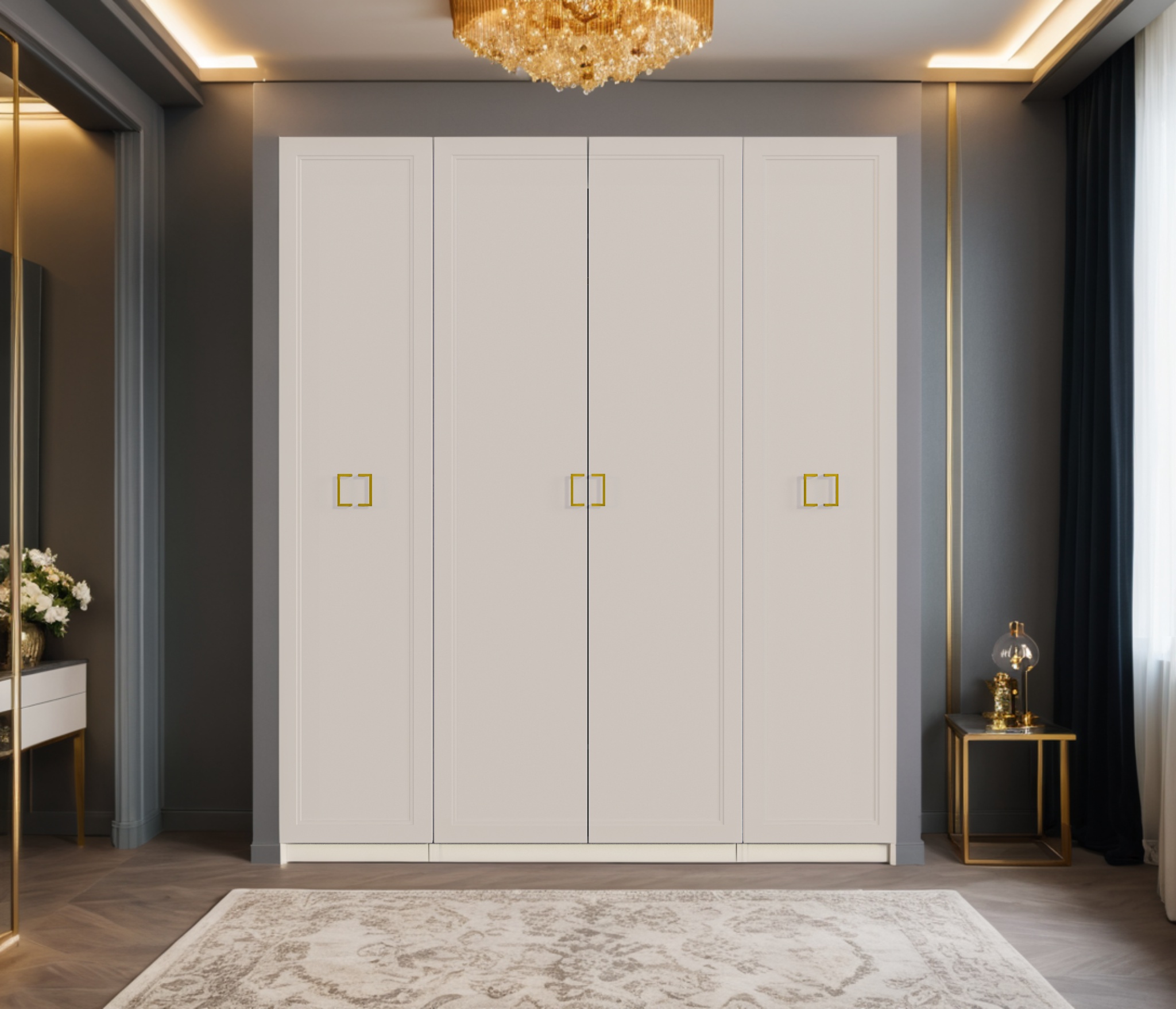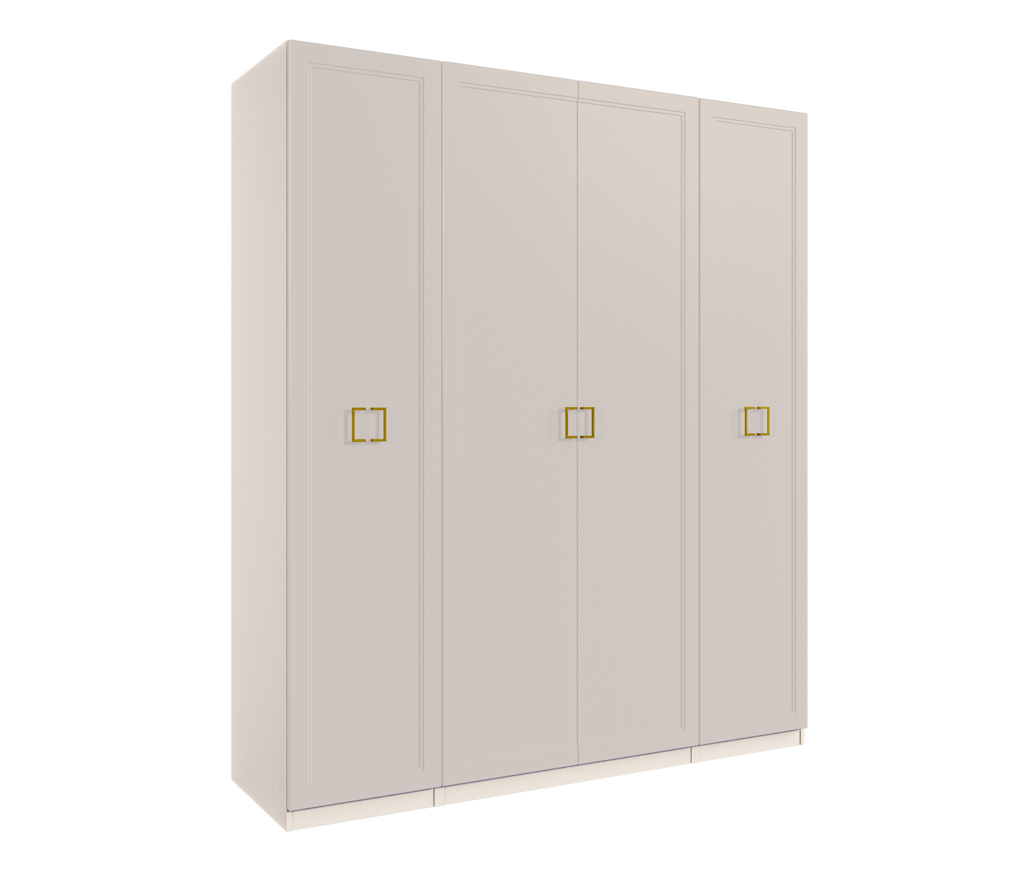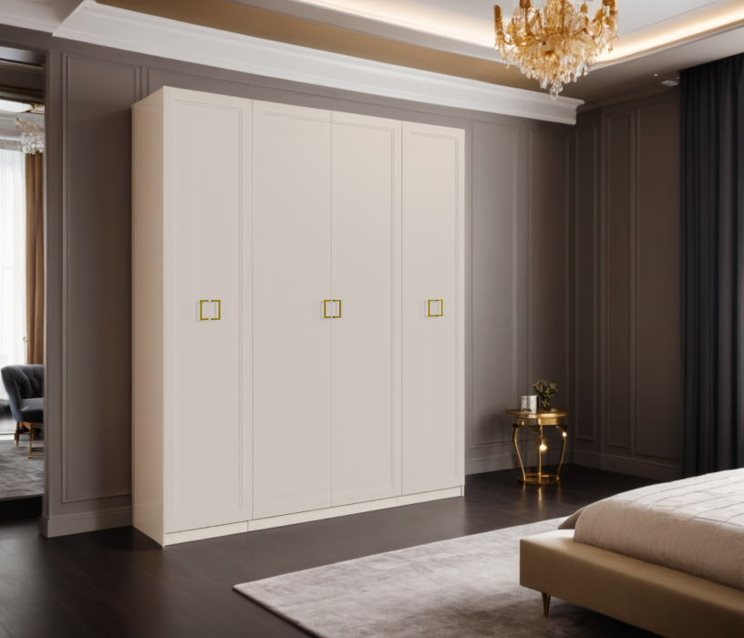 Четырехдверный шкаф Ассоль — стильное и практичное решение для вашего интерьера. Корпус из прочного ЛДСП и фасады из качественного МДФ с элегантными золотыми ручками придают шкафу изысканный вид. Внутреннее наполнение включает полки, ящики и штангу для одежды, обеспечивая удобство и порядок в хранении вещей. Идеально подходит для любой комнаты!