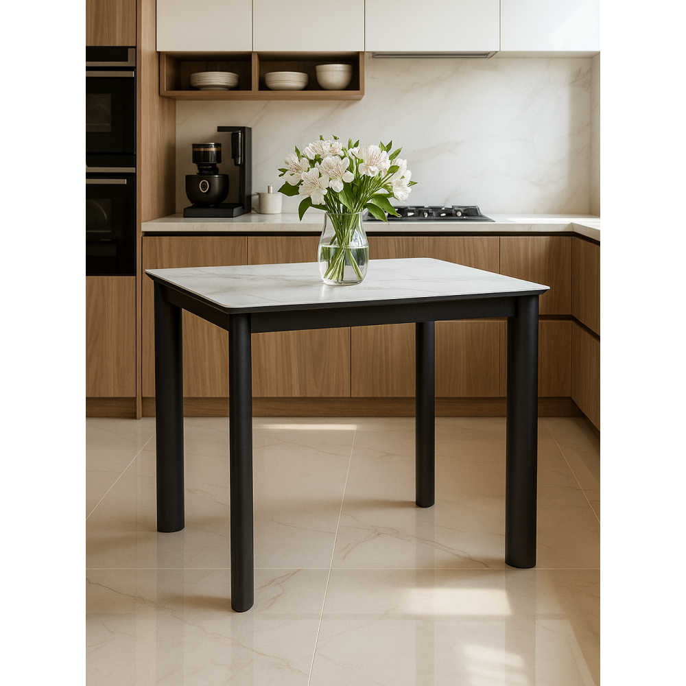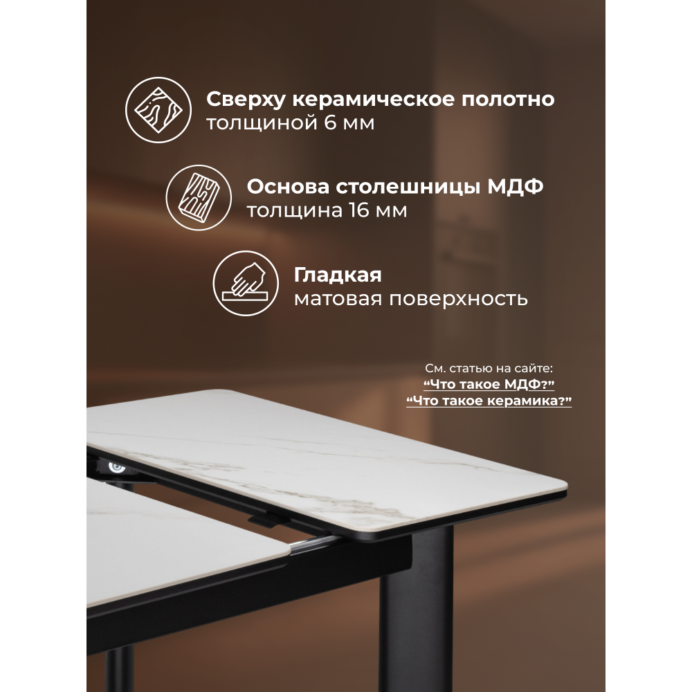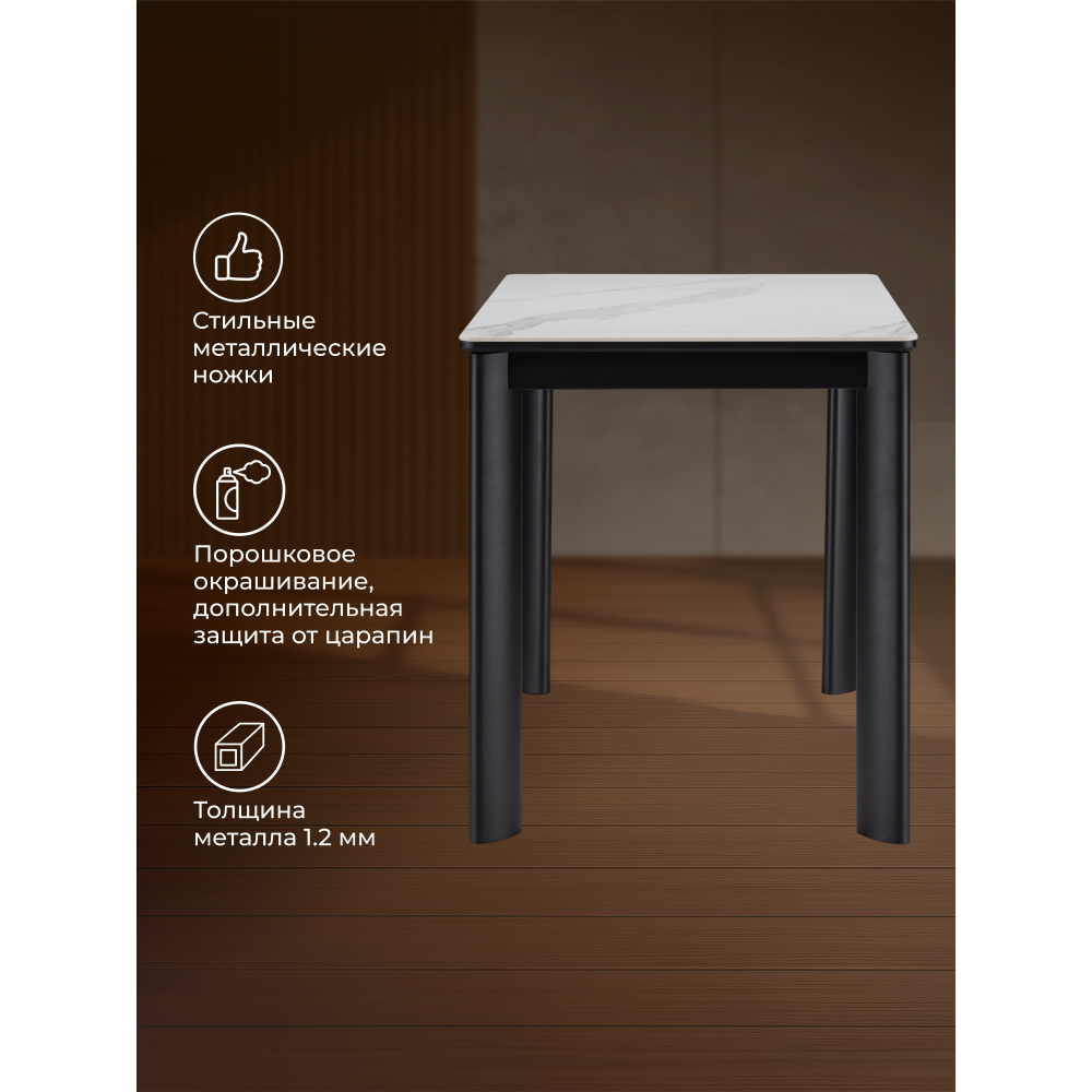 Идеальный стол для современной кухни - легкий, вместительный, с самым современным и дорогим покрытием и надежным, беспроблемным механизмом раскладки. Расстояние между ножками: 72 х 47 см. Толщина столешницы: 2 см.