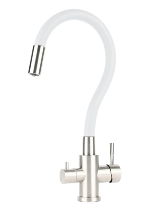 Смеситель для кухни из нержавеющей стали с гибким изливом в силиконовой оплетке, с выделнным каналом для питьевой воды.