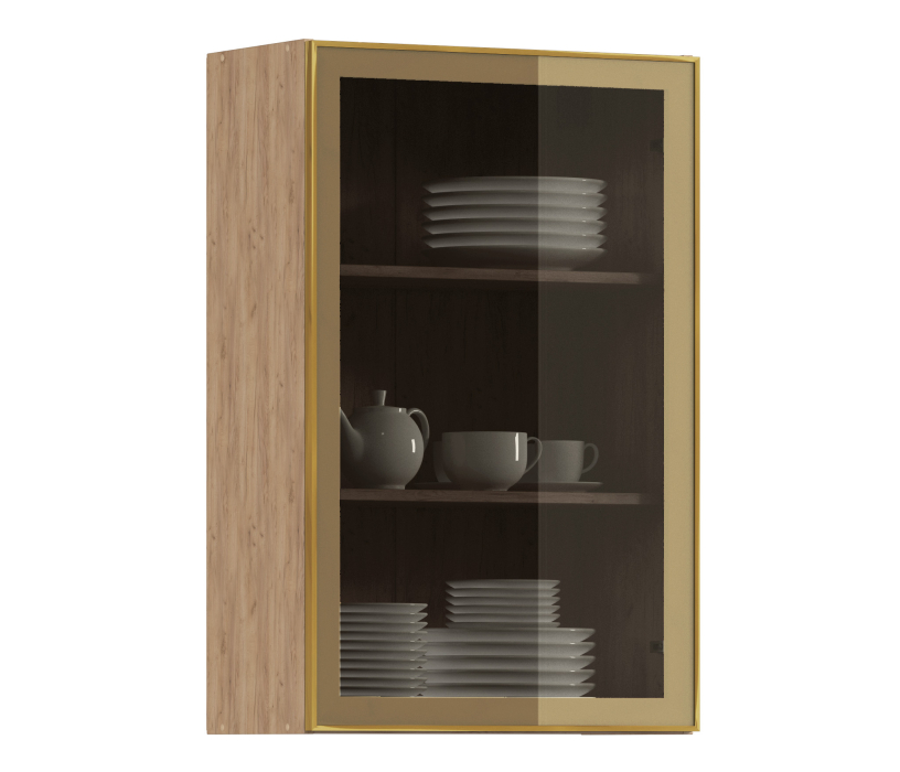Комплект включает в себя корпус кухонной полки (цвета дуб вотан) с необходимой фурнитурой, фасад из алюминиевой рамки золотого цвета и бронзового стекла, а также ручку, соответствующую цвету рамки фасада.
