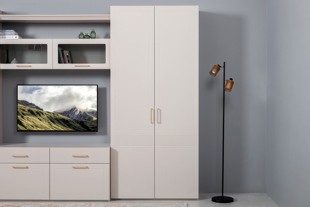 Петли с доводчиками, полное выдвижение ящиков, выдвижная штанга в шкафу для одежды и съемные полки делают использование максимально комфортным.