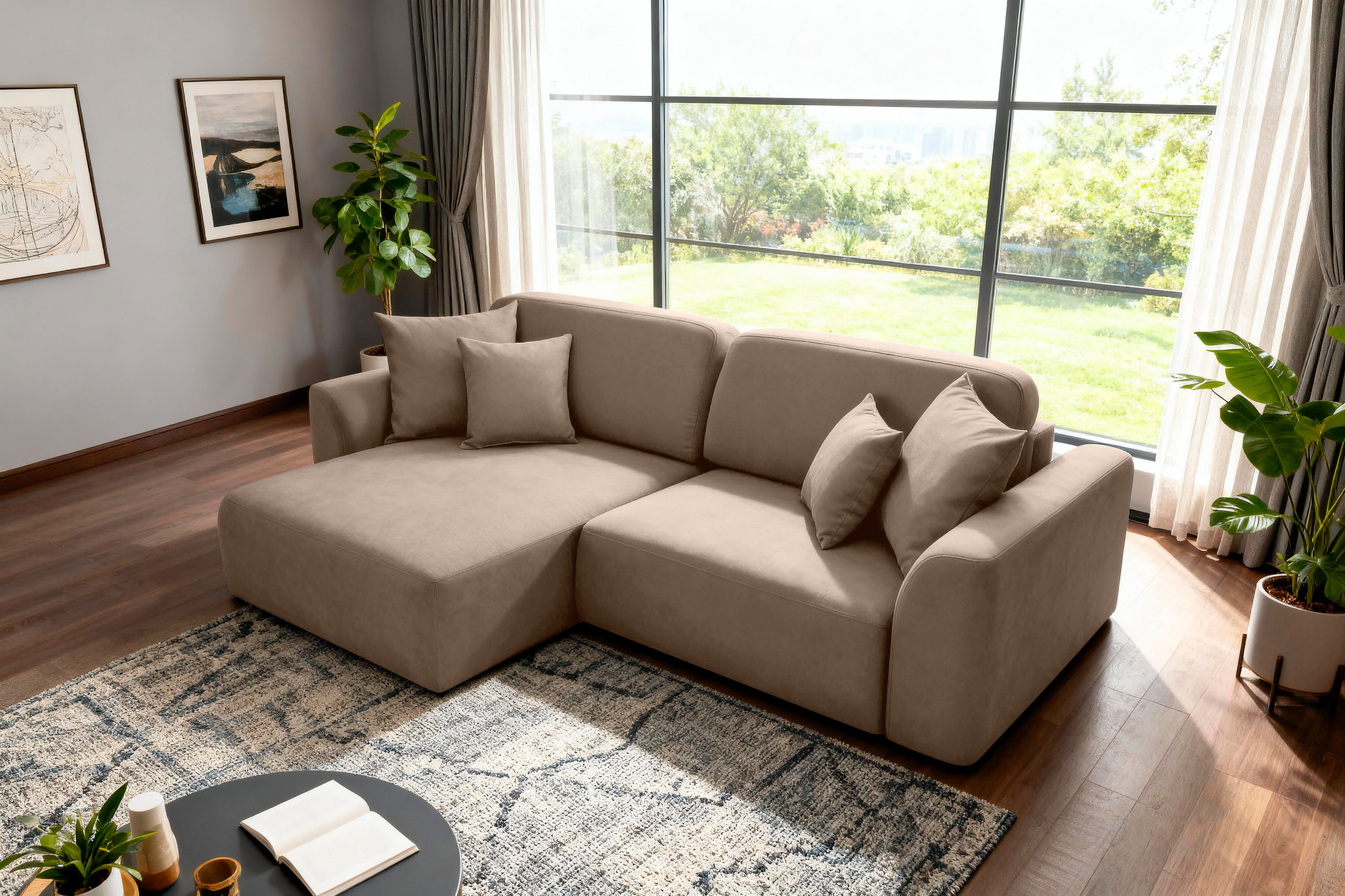 Широкие подлокотники и упругое сиденье с независимым пружинным блоком гарантируют комфорт и поддержку, а комплект мягких декоративных подушек добавляет уют и стиль.