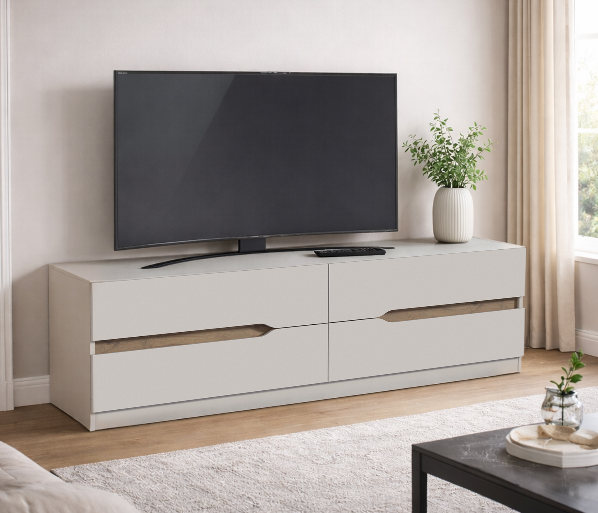 Особенностью данной модели являются плавные вырезы в фасадах, которые не только удобны для открывания, но и добавляют оригинальности. Внутри этих вырезов расположены вставки цвета Дуб вотан, что создает контраст и подчеркивает эстетику мебели.