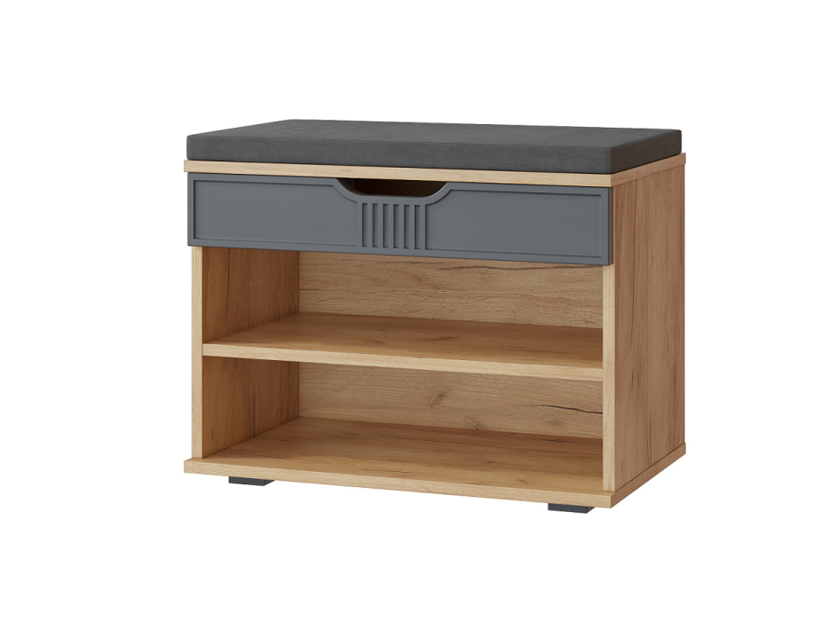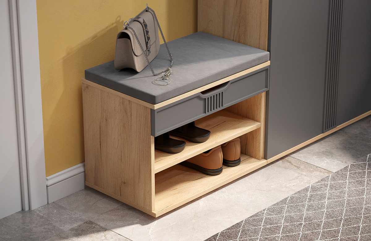 Тумба для обуви Эмилия ЭЛ-44К – компактная модель для комфортного переобувания в прихожую. Лаконичное изделие оборудовано двумя полками для обуви и мягким сиденьем, под которым находится удобный ящик для хранения чистящих средств, щеток или зонта. Ткань мягкой части велюр, наполнение: поролон 40 мм, синтепон, белый флизелин. Высота опоры 20 мм.