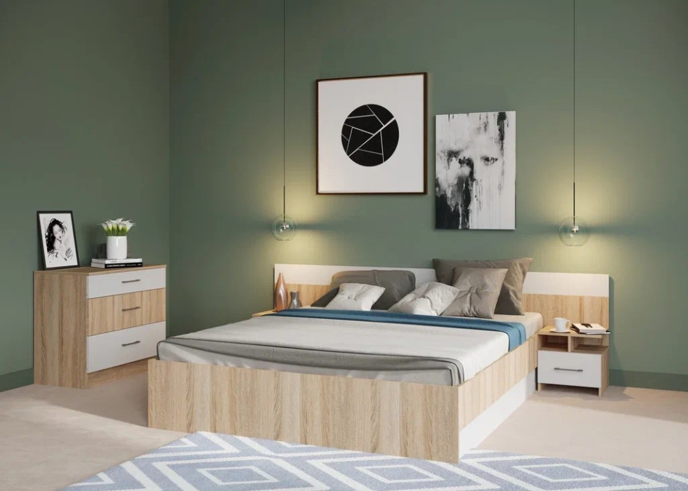 Спальня Алена выполнена в стиле минимализм - естественные цвета, текстура дерева, простота и функциональность. В комплекте Алена оптимальный набор функциональных модулей, который необходим для обустройства спальни: комод с ящиками, кровать с крепким и надежным основанием из ламинированной плиты и прикроватные тумбы. Кровать с двух сторон идеально дополняют идентичные по стилю прикроватные тумбы с высокой стенкой на одном уровне с изголовьем кровати - это создает визуальную целостность, добавляет ощущение защищенности.