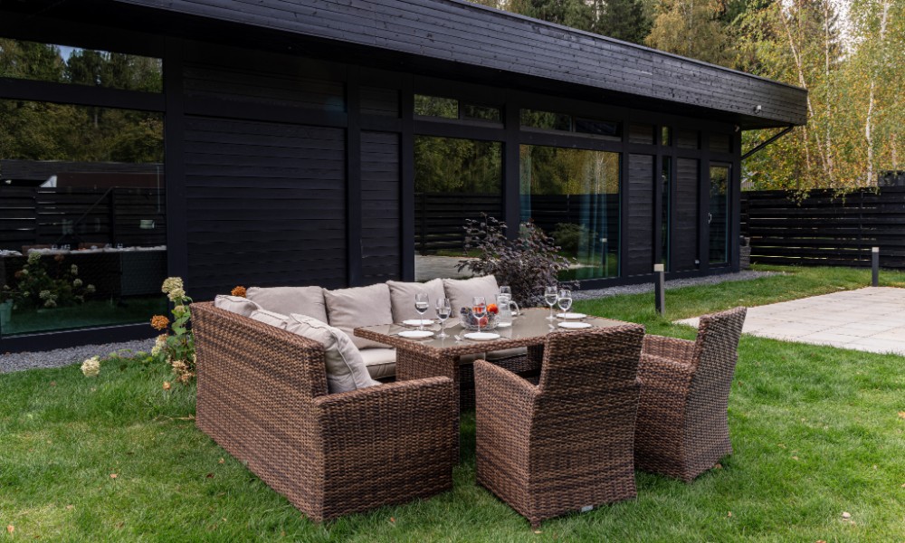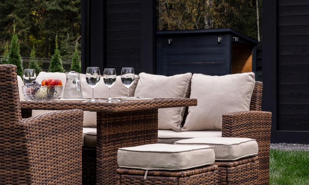 Материал комплекта - искусственный ротанг (ручного плетения)