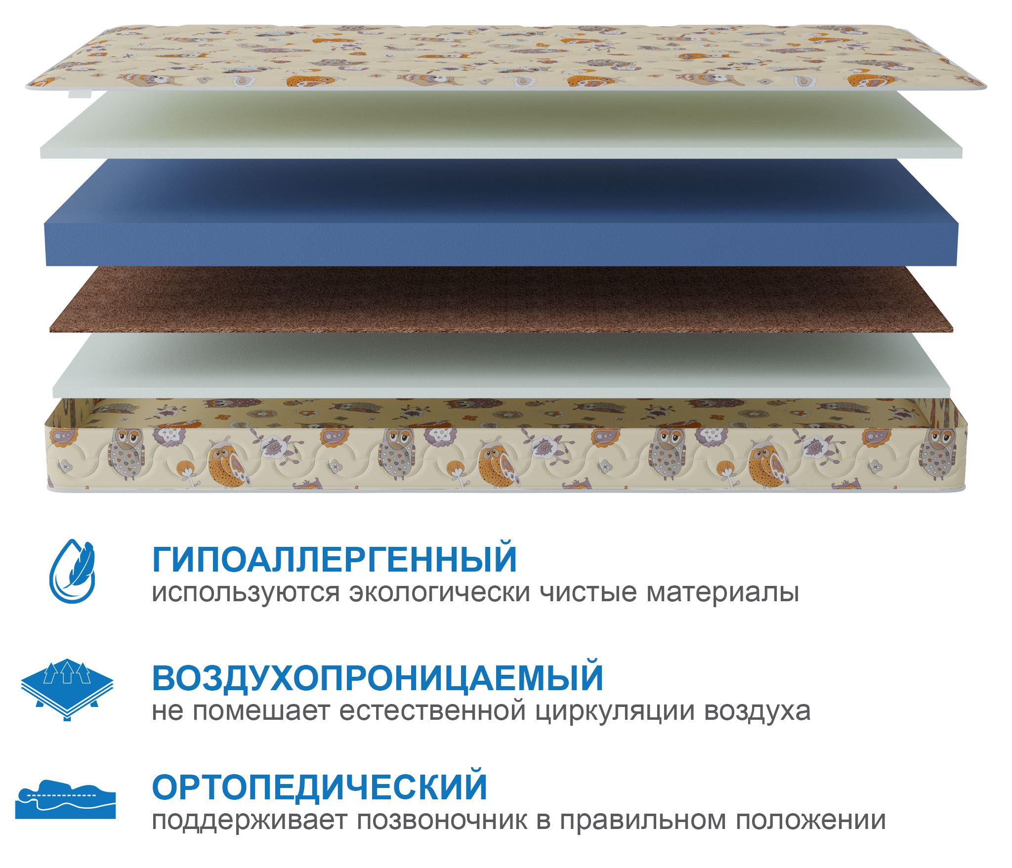 Легкий, прочный, удобный матрас, который подойдет для всех деток. Чехол- 100% Хлопок.Рекомендовано использование с защитным чехлом Аквастоп. |