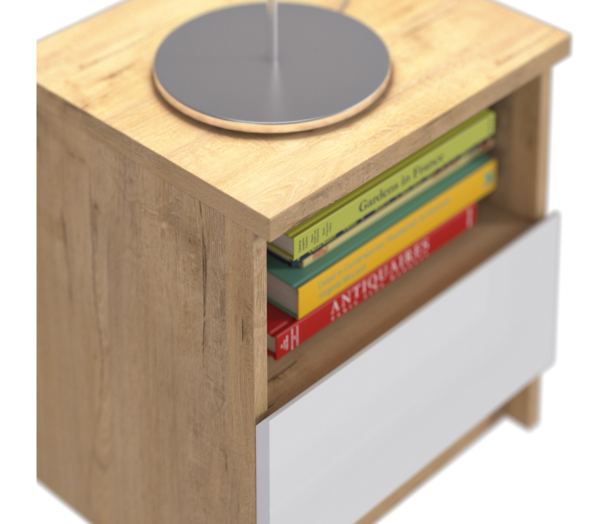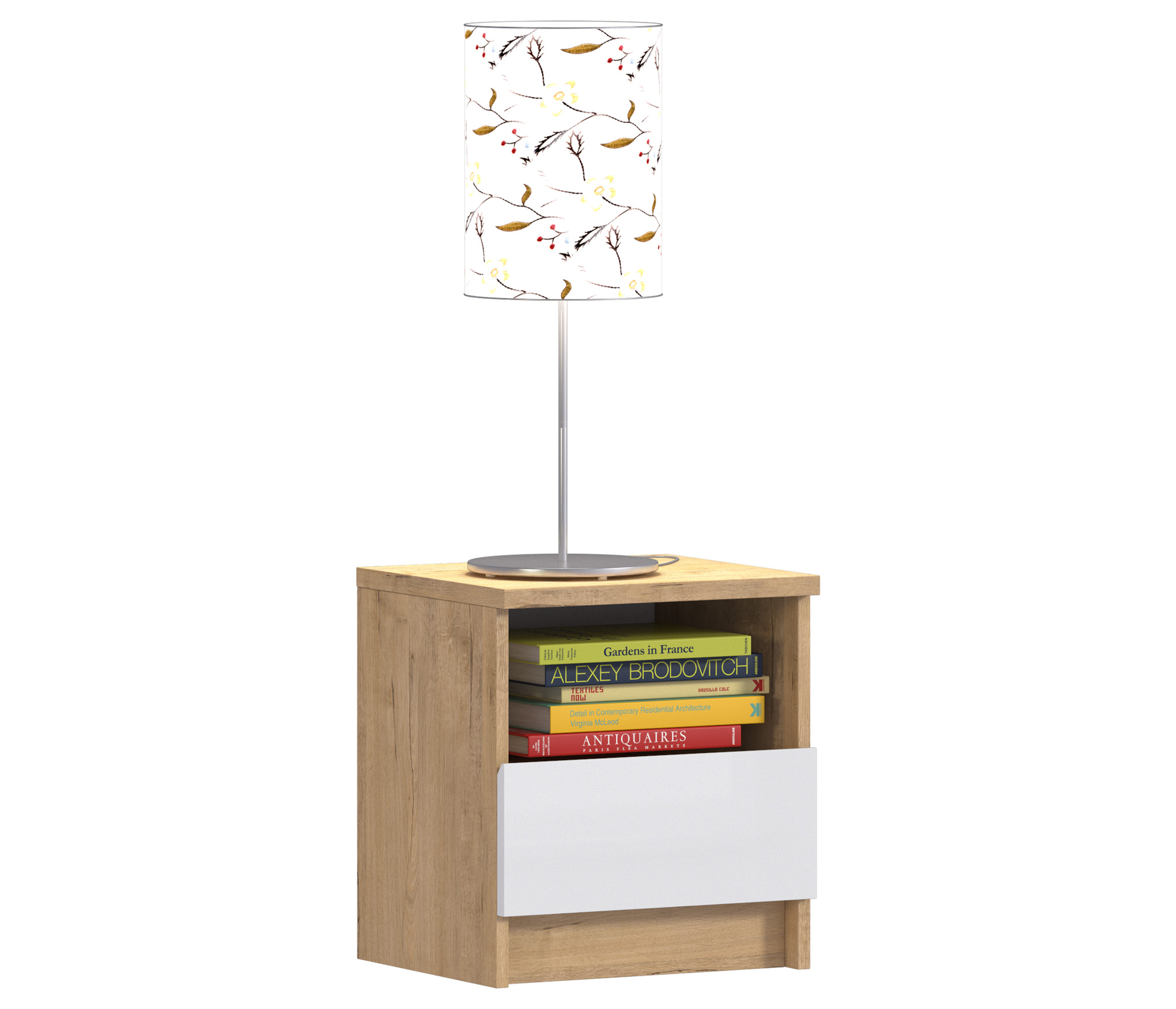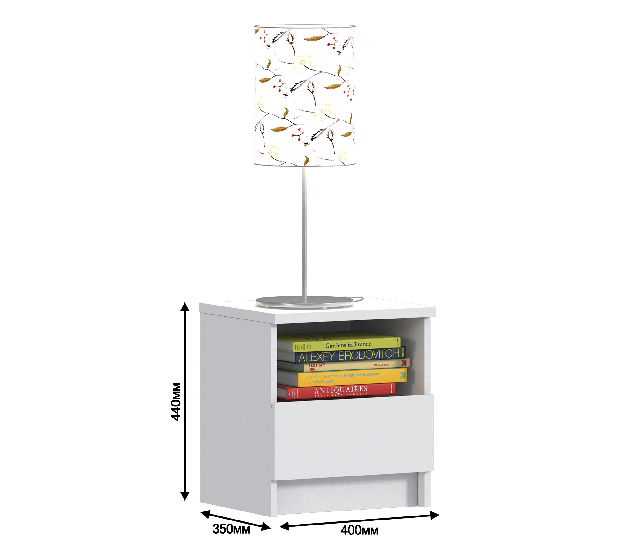 Габаритные размеры тумбы - ширина 40 см, высота 44 см, глубина 35 см, Один выдвижной ящик и открытое отделение, куда положить планшет или книгу. Стиль тумбы современный - Сканди, хай тек. Наиболее выигрышно тумба будет смотреться в интерьере в сочетании с другими предметами мебели из коллекции "Веста". Корпус и фасад тумбы выполнен из современного и прочного ЛДСП.
