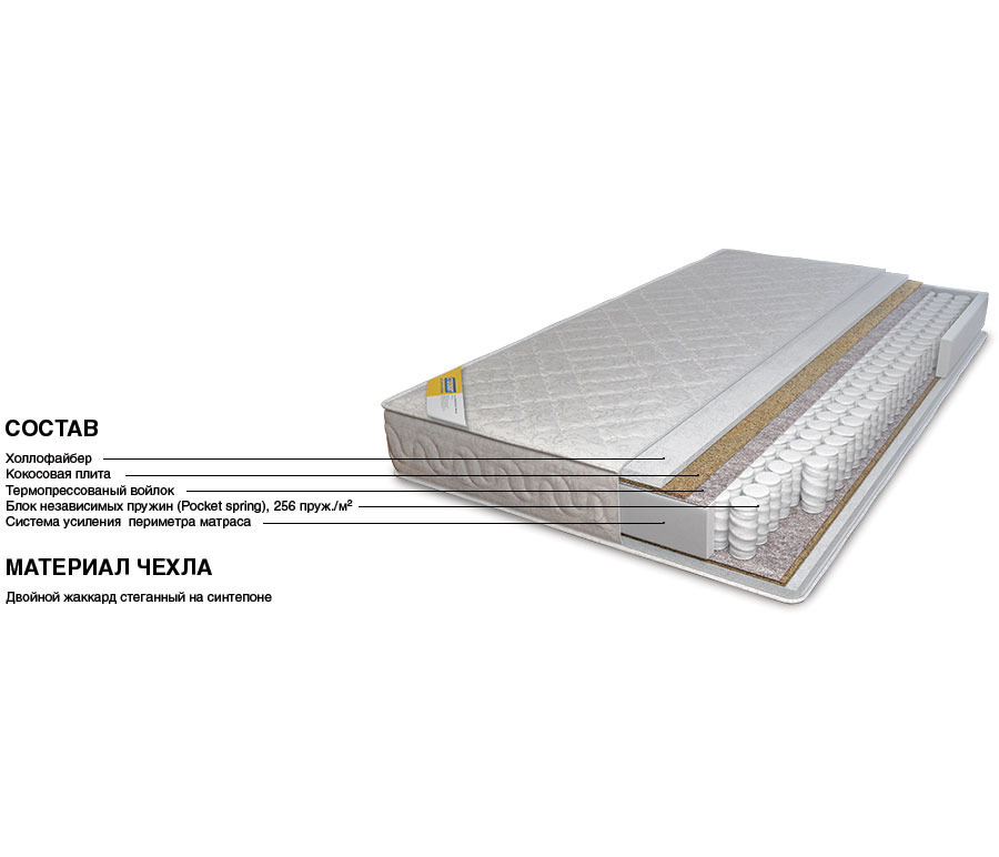 Матрас: холлофайбер 20мм, кокосовая плита 10мм, термопрессованый войлок, блок независимых пружин (Pocket spring) 256 пруж./м2, система усиления периметра матраса