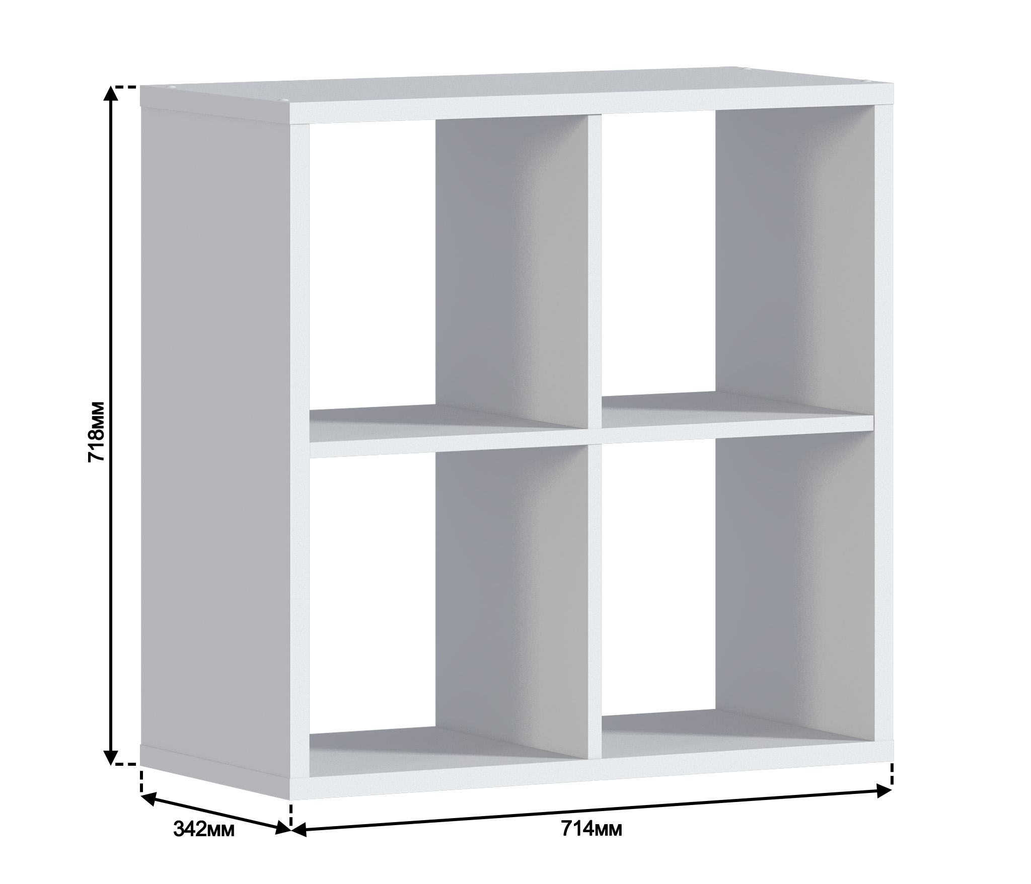 Габаритные размеры – ширина 71 см, высота 71 см и глубина 34 см. Конструктивно стеллаж представляет собой четыре отделения. Выполнен стеллаж из современного и прочного КДСП в белом цвете. Стеллаж идеально подойдет для оформления кабинета, гостиной, детской, спальни и даже прихожей в современном стиле.