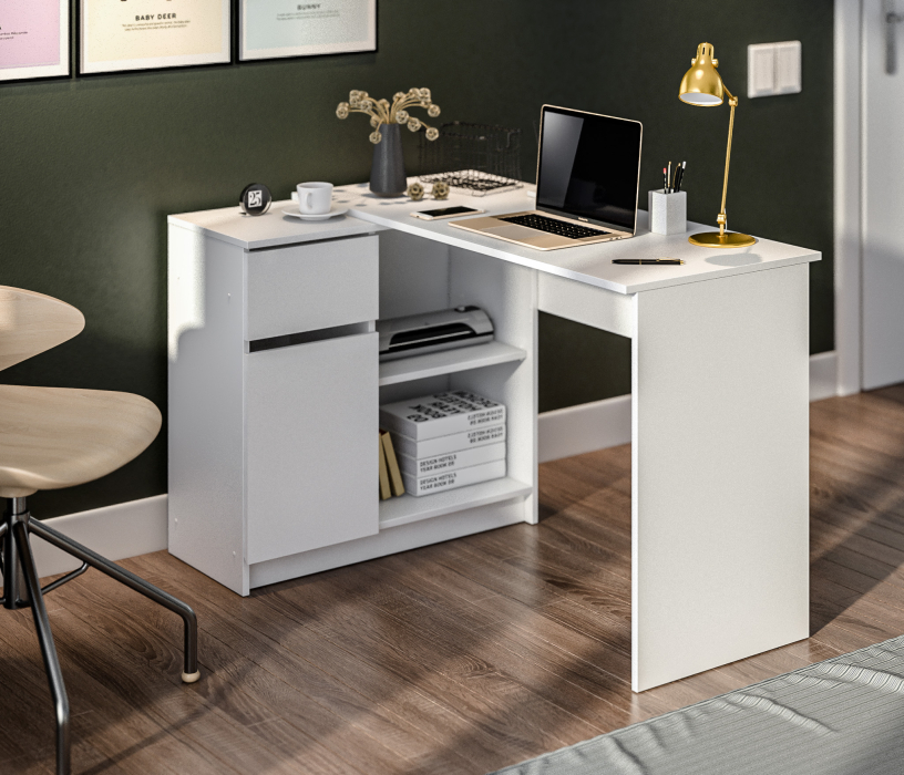 Габаритные размеры – ширина 119 см, высота 75 см и глубина 80 см. Под рабочей поверхностью расположена тумба с открытыми вместительными полками, а также выдвижной ящик и закрытое отделение с отдельной дверцей. Стол произведен из современного экологичного ЛДСП. Возможен как левый, так и правый вариант сборки.