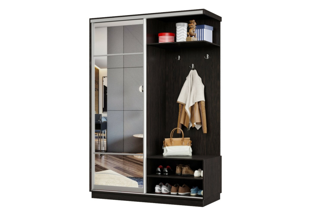 В прихожей используется одна дверь, которая перемещается по однополосному треку вправо или влево, закрывая или открывая каждую из двух частей шкафа.