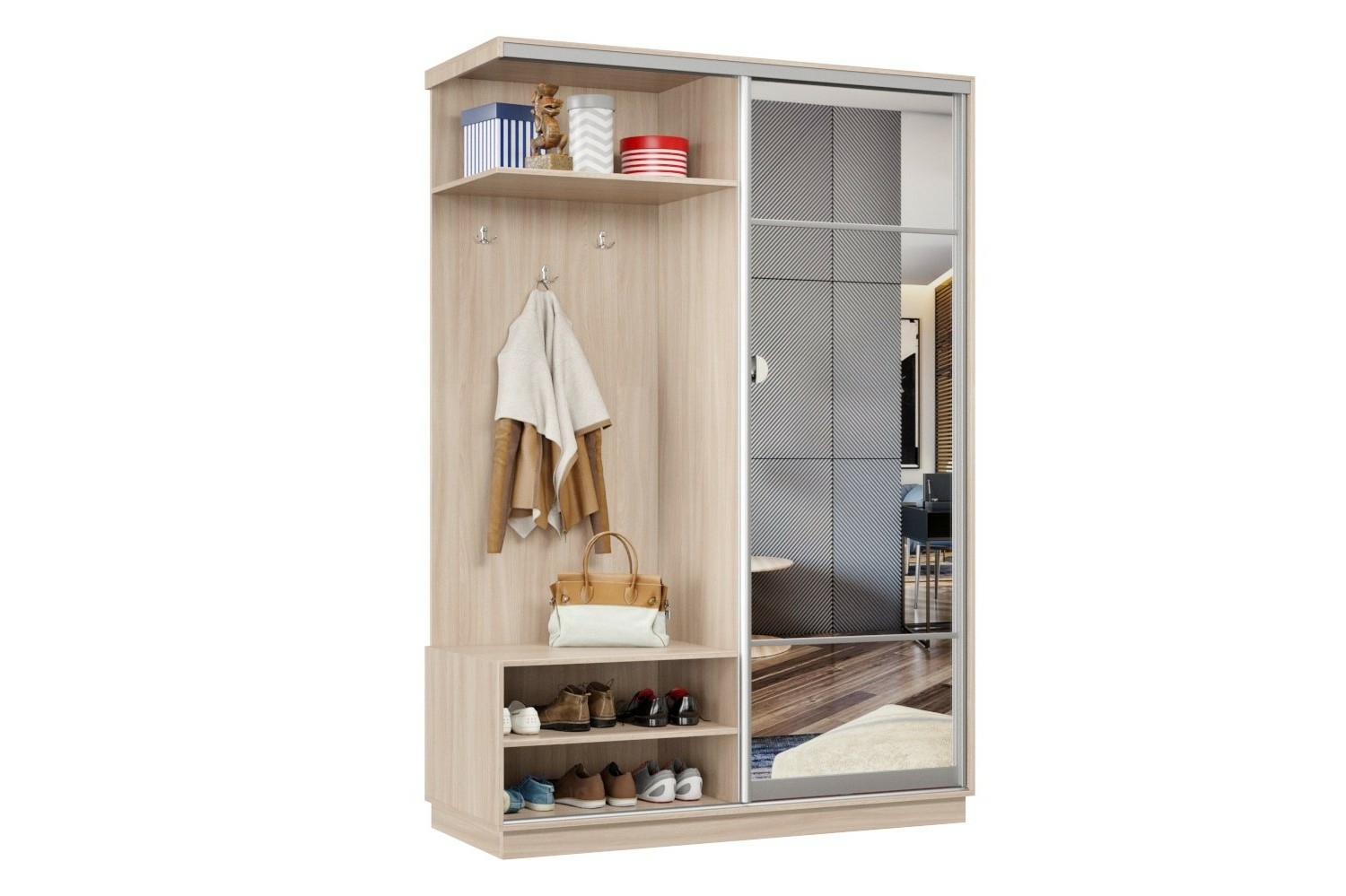 Дверь делит шкаф на 2 равные части: отделение для верхней одежды и отделение с полками и крючками.