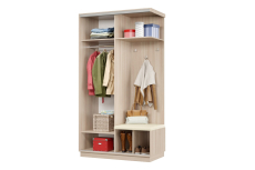 Дверь делит шкаф на 2 равные части: отделение для верхней одежды и отделение с полками и крючками.
