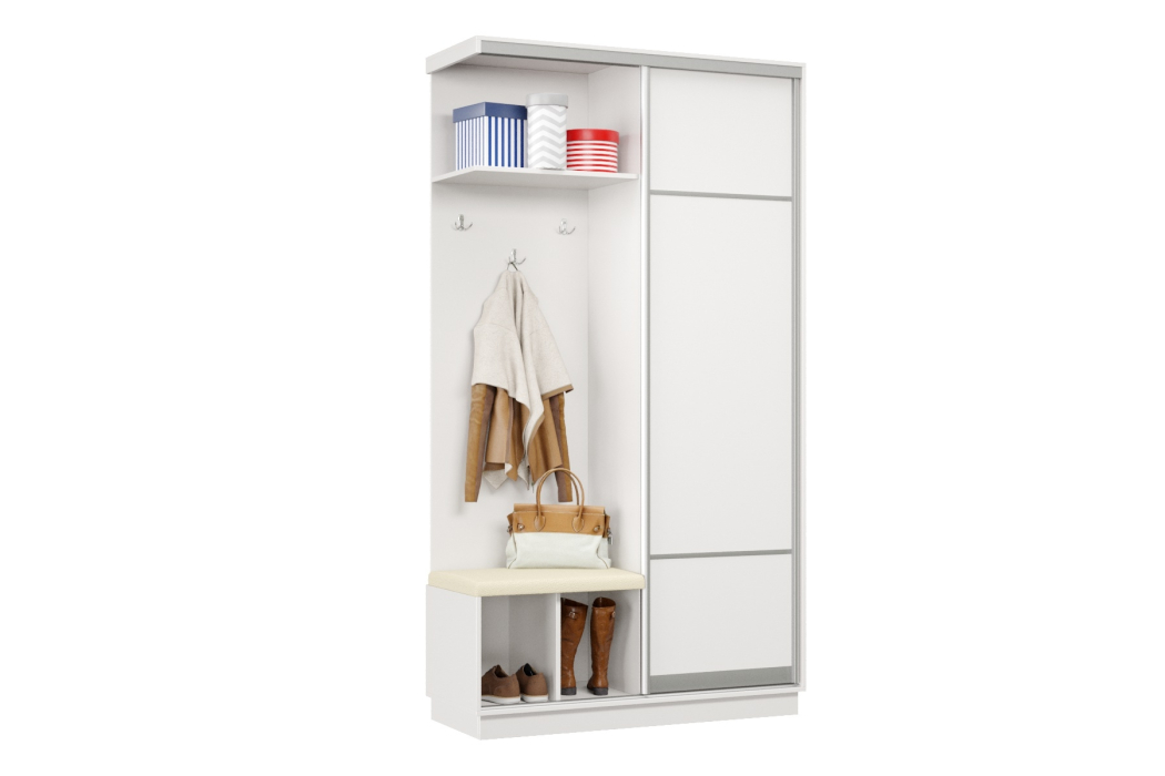 В прихожей используется одна дверь, которая перемещается по однополосному треку вправо или влево, закрывая или открывая каждую из двух частей шкафа.