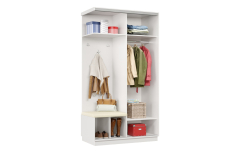 Дверь делит шкаф на 2 равные части: отделение для верхней одежды и отделение с полками и крючками.
