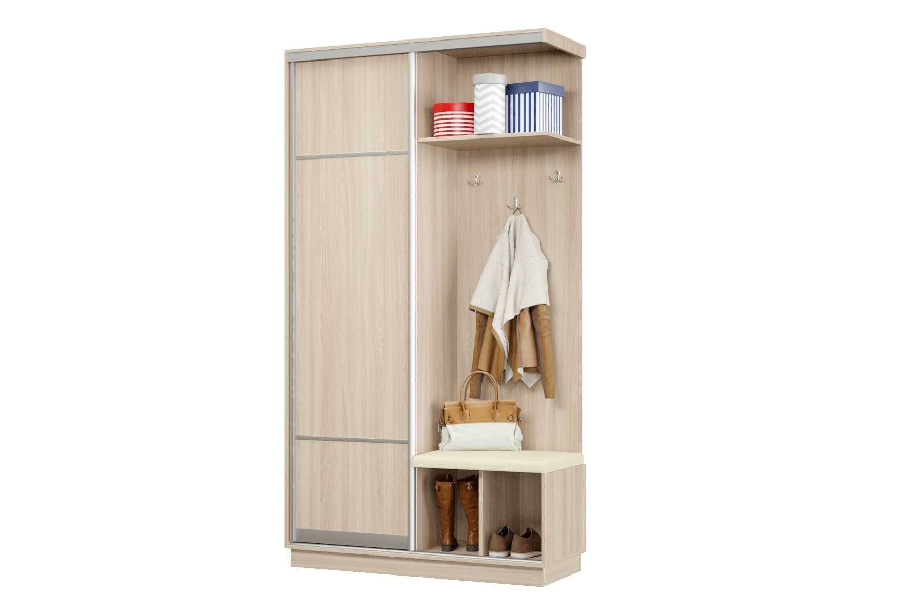 Дверь делит шкаф на 2 равные части: отделение для верхней одежды и отделение с полками и крючками.