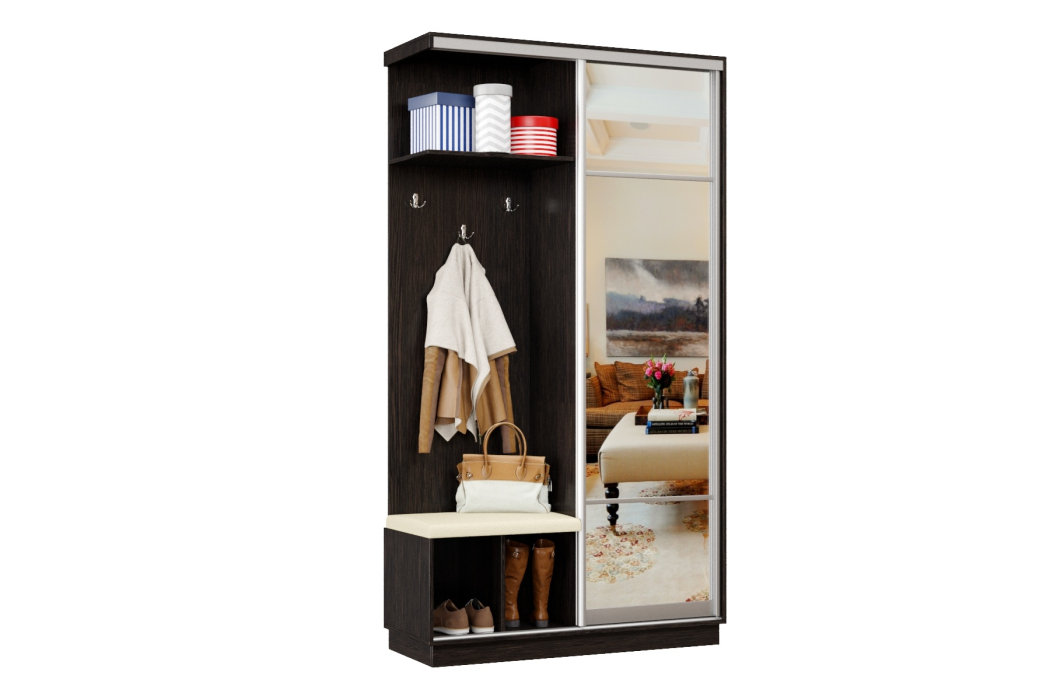За счет применения системы купе прихожая отлично зарекомендовала себя в узких коридорах, где распашная дверь ограничивает пространство. Несмотря на небольшие габариты, прихожая-купе получилась функциональной и практичной.
