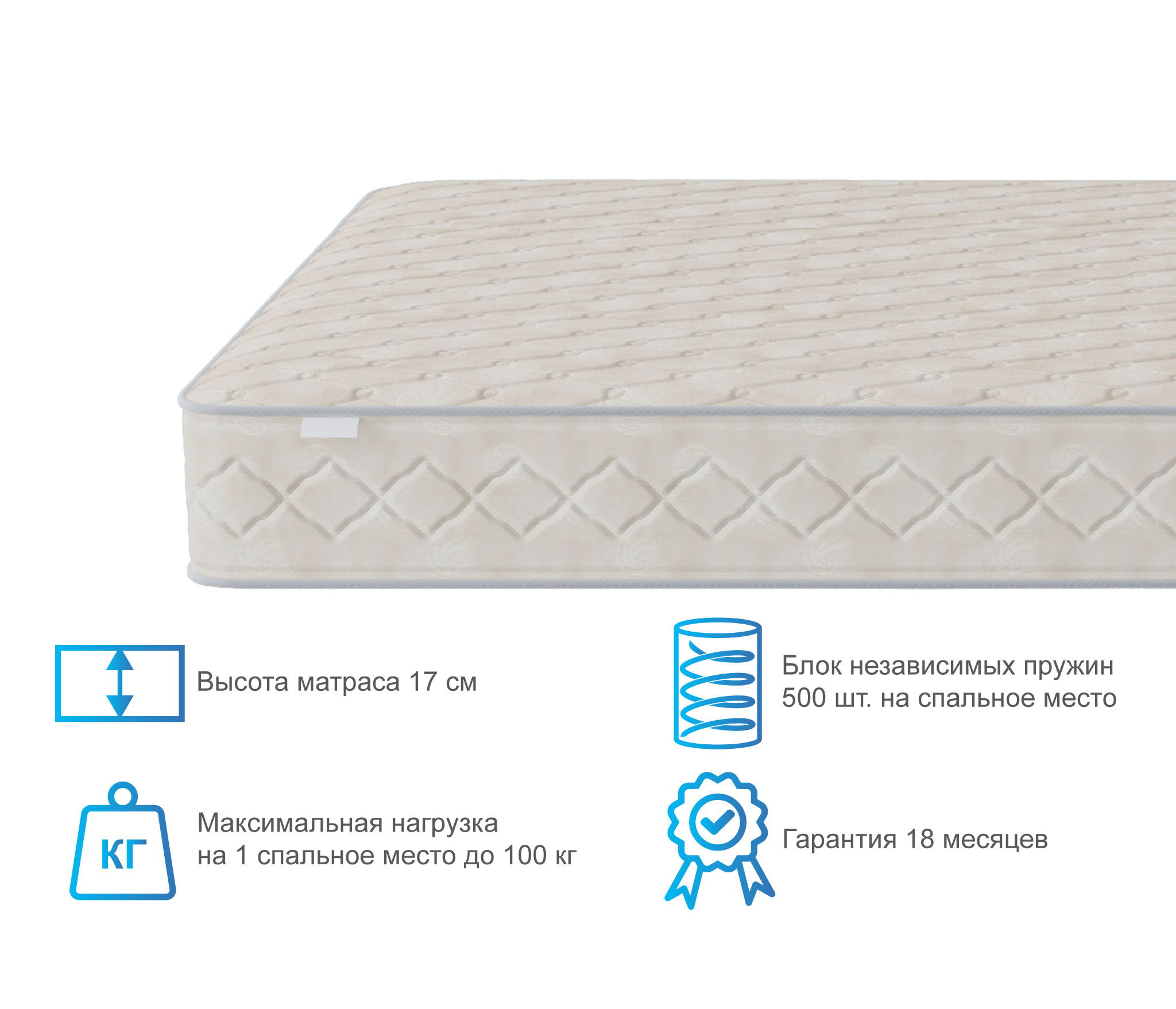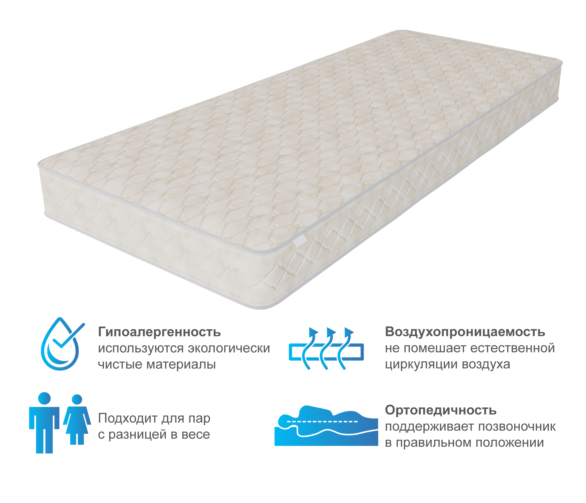 Матрас купили в дополнении к кровати. Остались им довольны. Жесткость у него средняя, спина не устает. Пружин не чувствуешь. Материал обивки хороший, приятный, швы надежные. Спасибо.