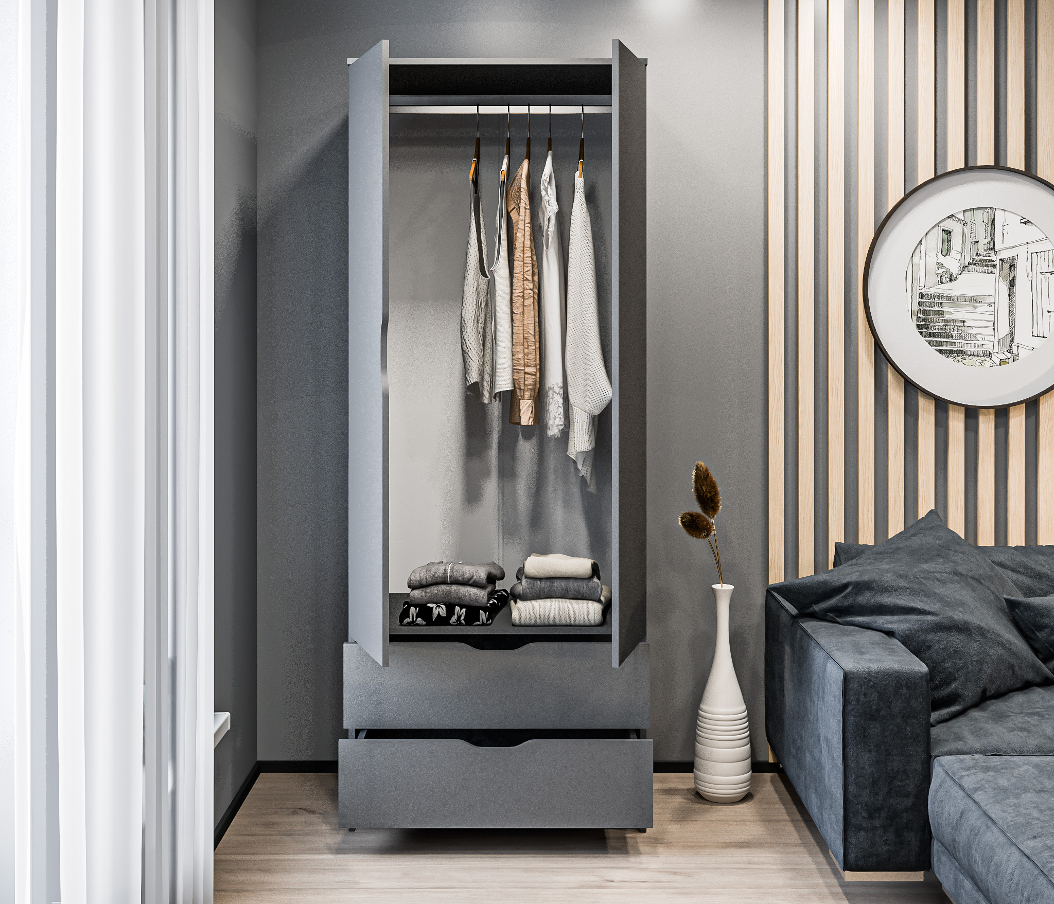 Дверцы шкафа не имеют ручек добавляют минималистичность в его дизайн.