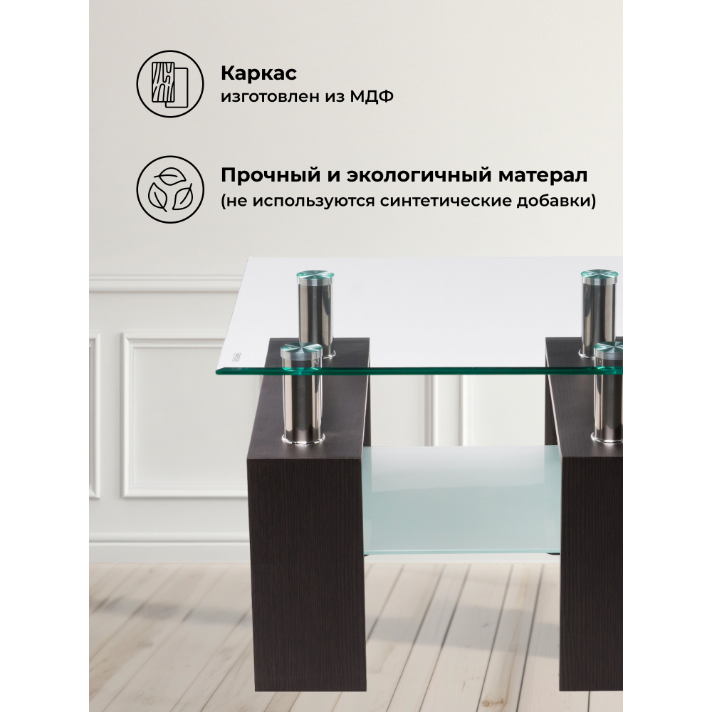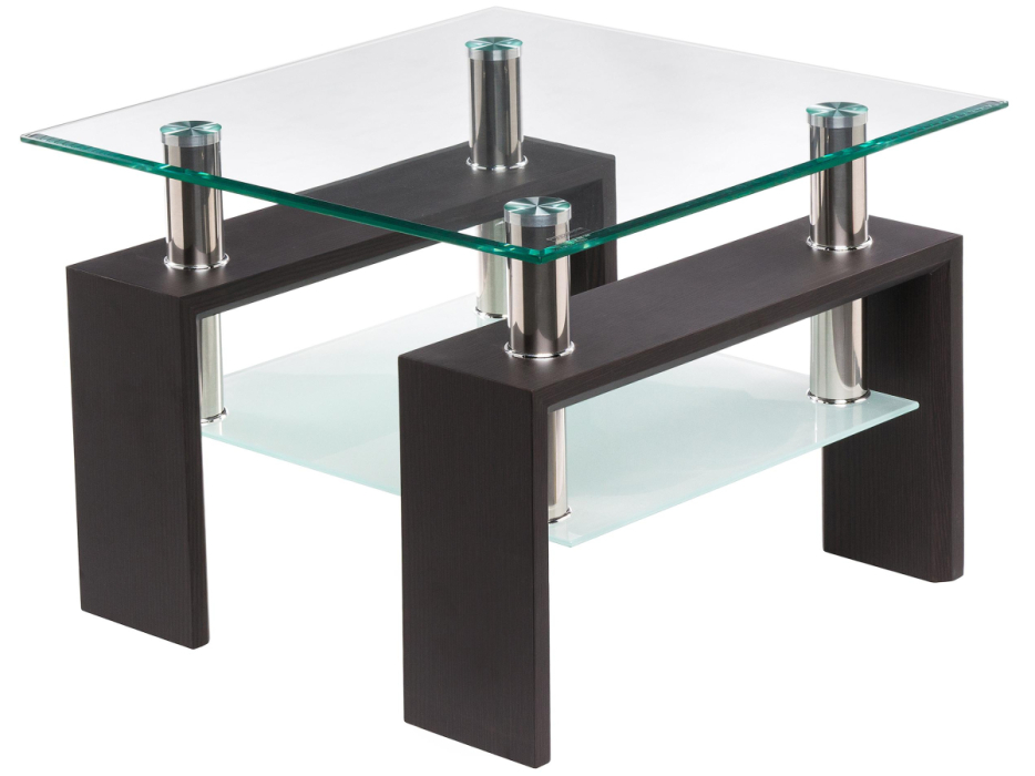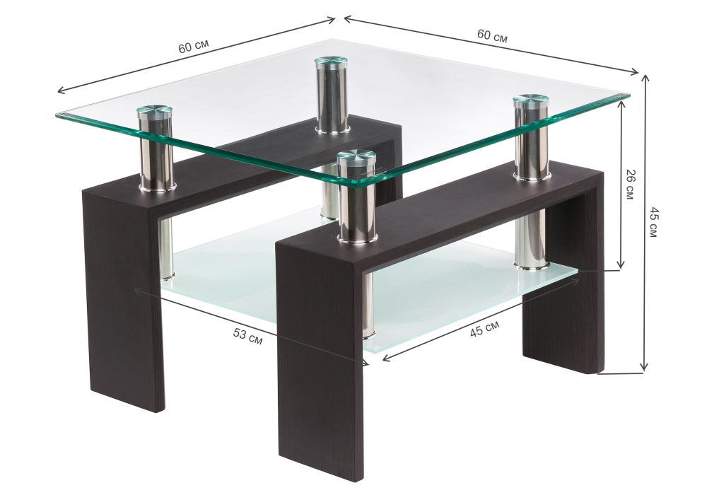 Журнальный столик ST-052 60х60х45 wenge с квадратной стеклянной столешницей в современном стиле. Толщина верхнего и нижнего стекла: 6 мм. Материал каркаса - ЛДСП и Металл. Ширина - 60; Высота - 45; Длина - 60.