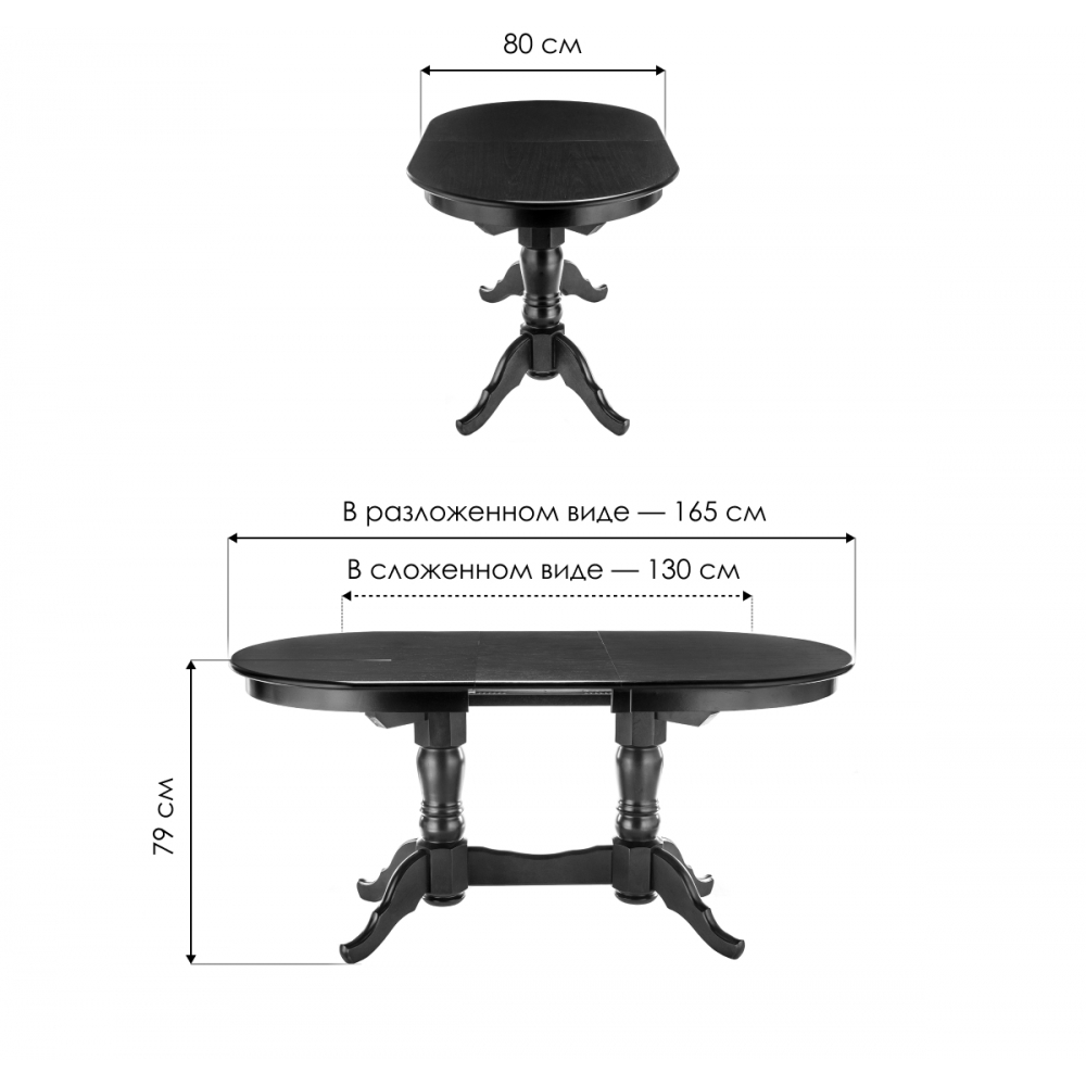 Материал каркаса - Массив дерева; Материал ножек - Массив дерева; Материал столешницы - МДФ / шпон; Цвет каркаса - Шоколад; Цвет ножек - Шоколад; Цвет столешницы - Шоколад; Цвет подстолья - Шоколад; Ширина - 80; Высота - 79; Длина стола в разложенном виде - 165; Длина - 130.