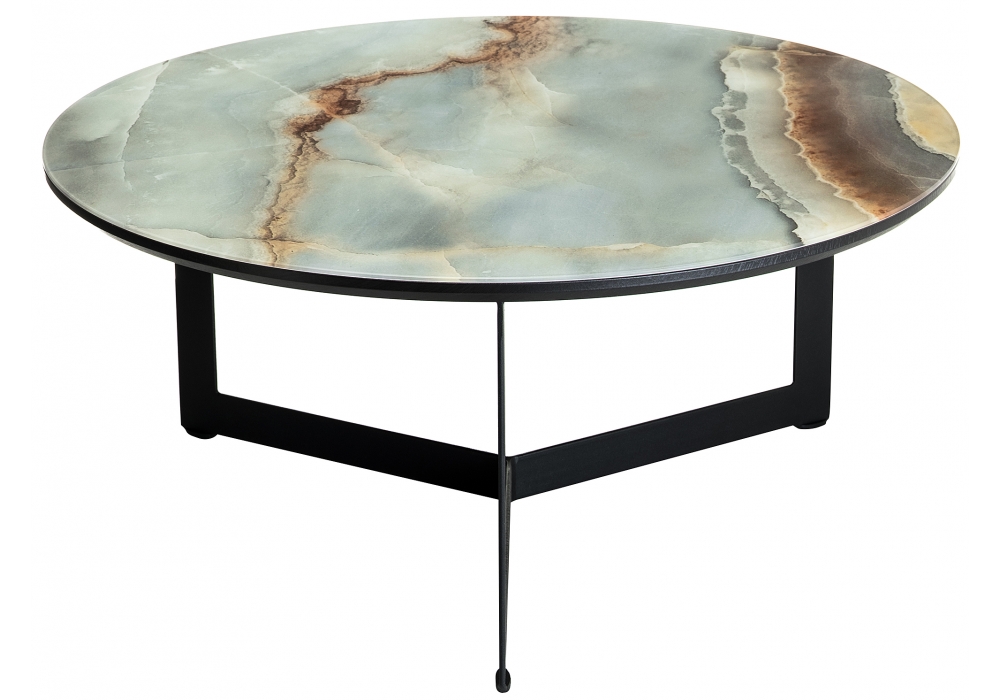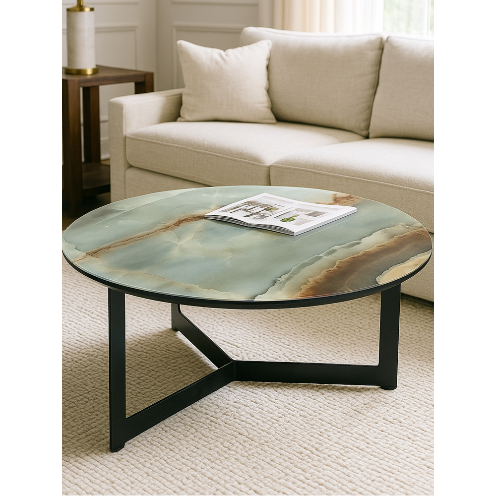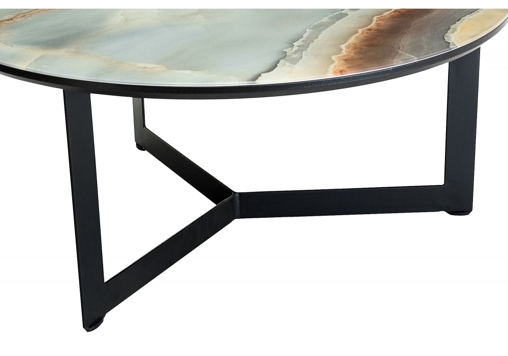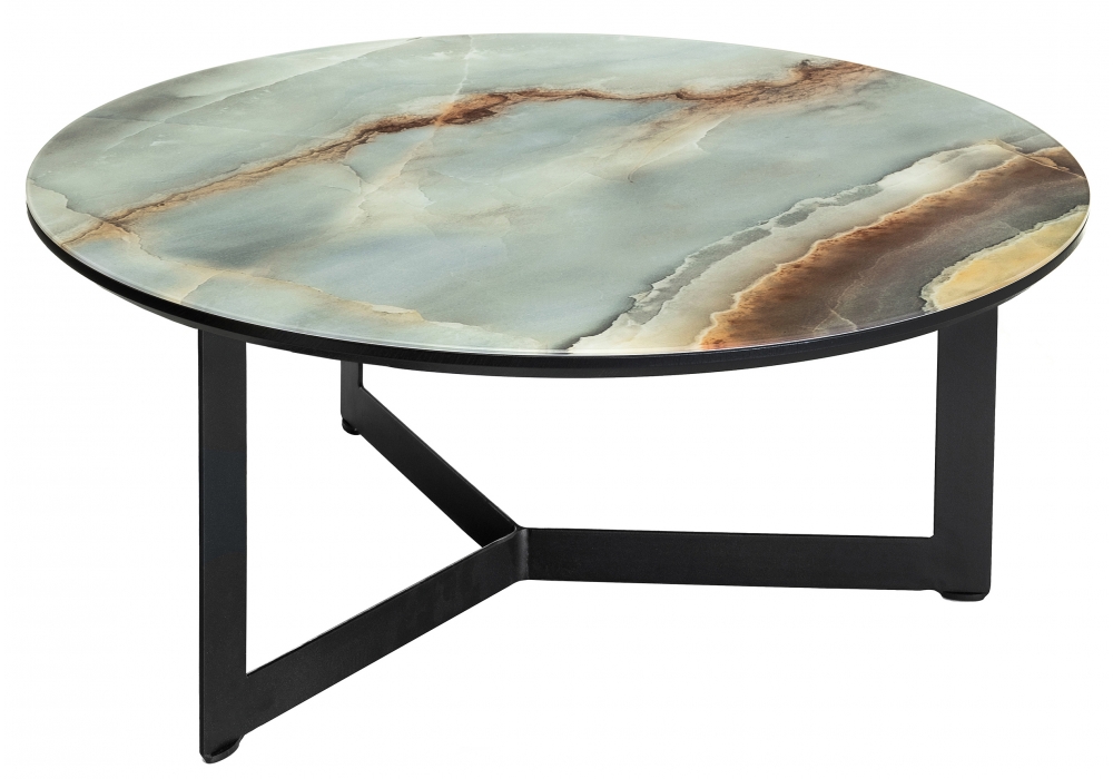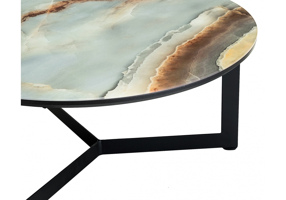 Материал каркаса - Металл; Материал ножек - Металл; Материал столешницы - Стекло; Цвет каркаса - Черный; Цвет ножек - Черный; Цвет столешницы - мрамор; Ширина - 70; Высота - 33; Длина - 70. Толщина стекла на столешнице - 4мм