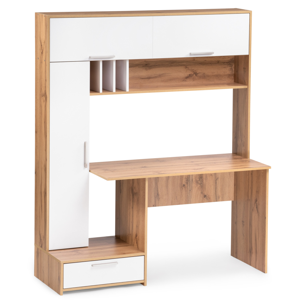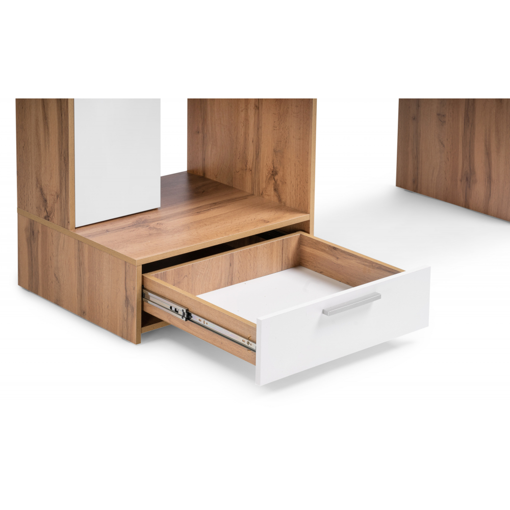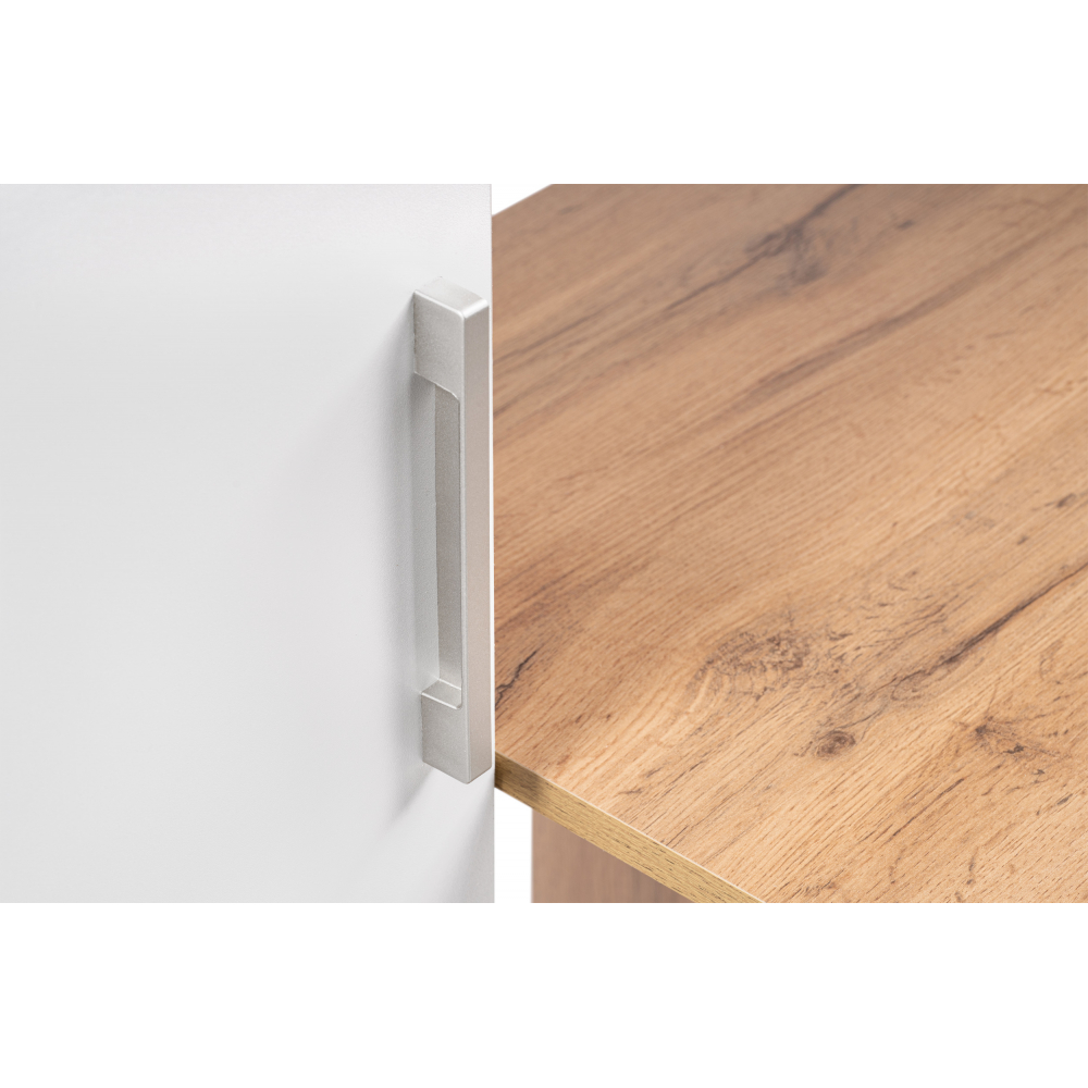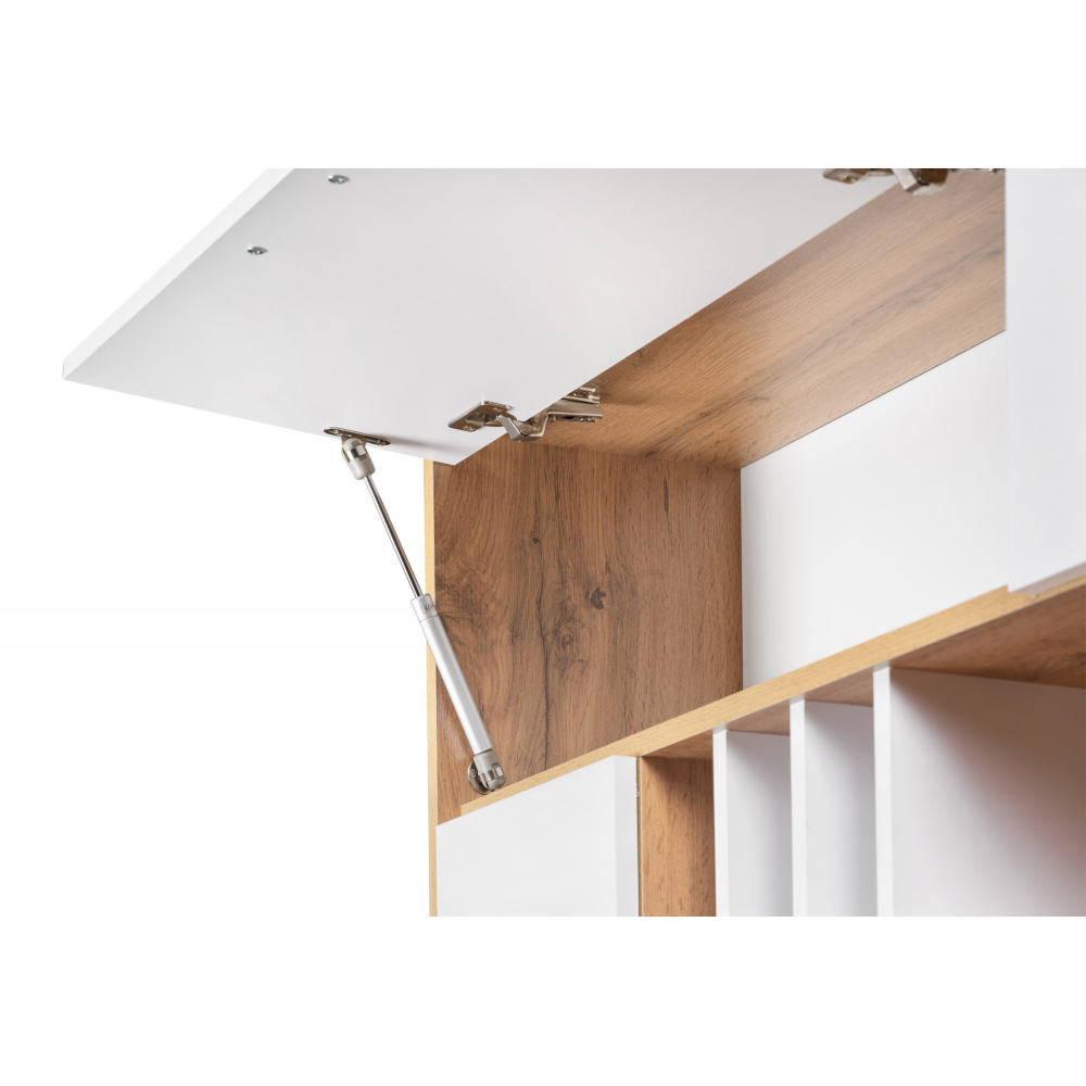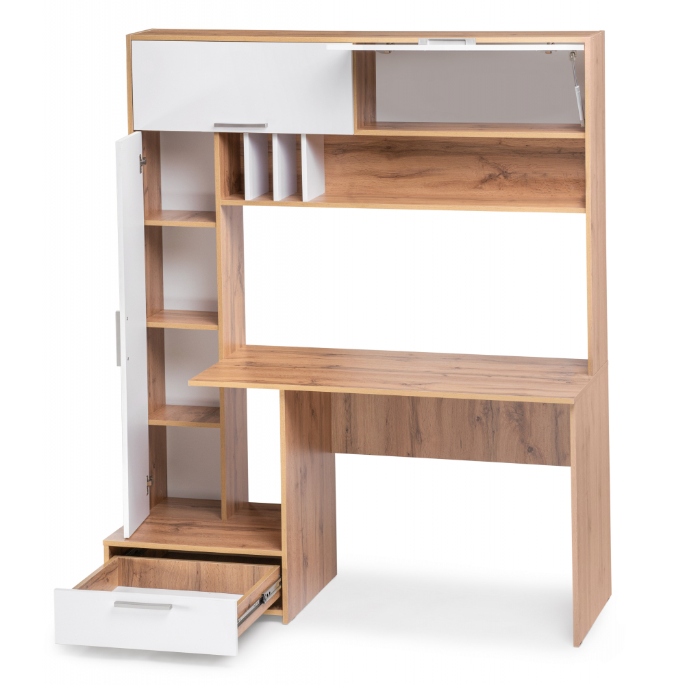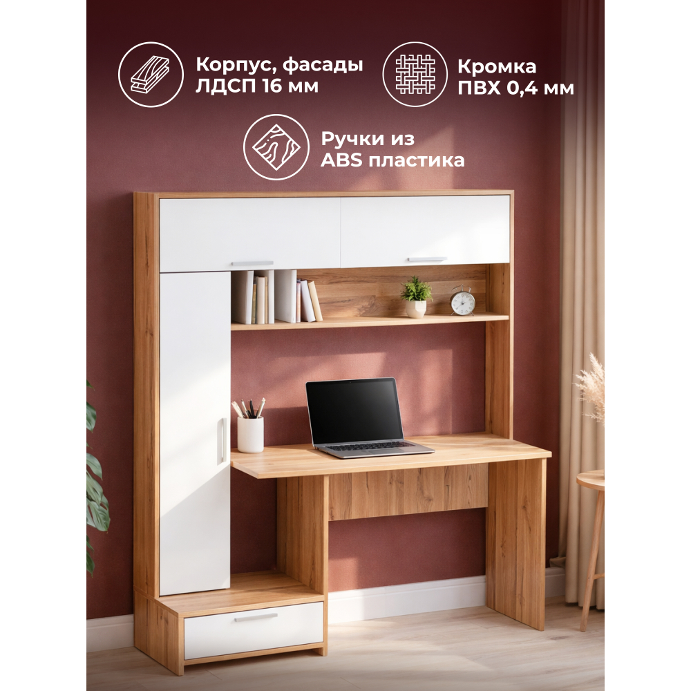 Стол Лайт 03.243 дуб золотой (craft) / белый премиум; ЛДСП. Высота стола без надстройки - 75см. Толщина столешницы - 1,6см. Горизонтальные фасады на газовых амортизаторах. Распашные двери на четырёхшарнирных петлях
